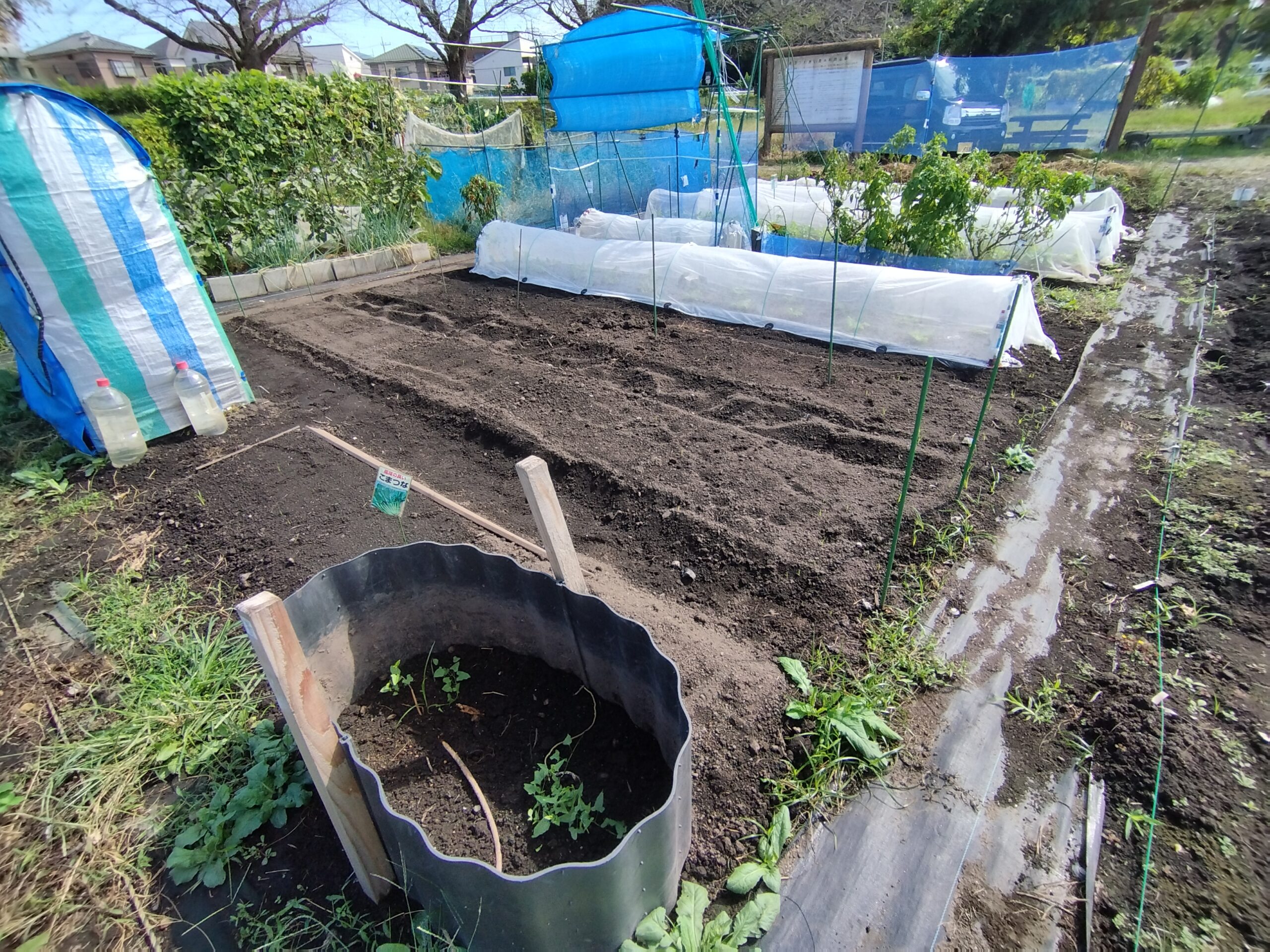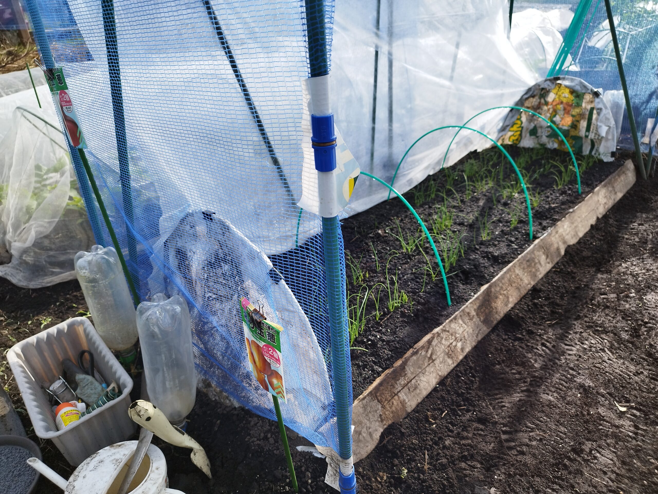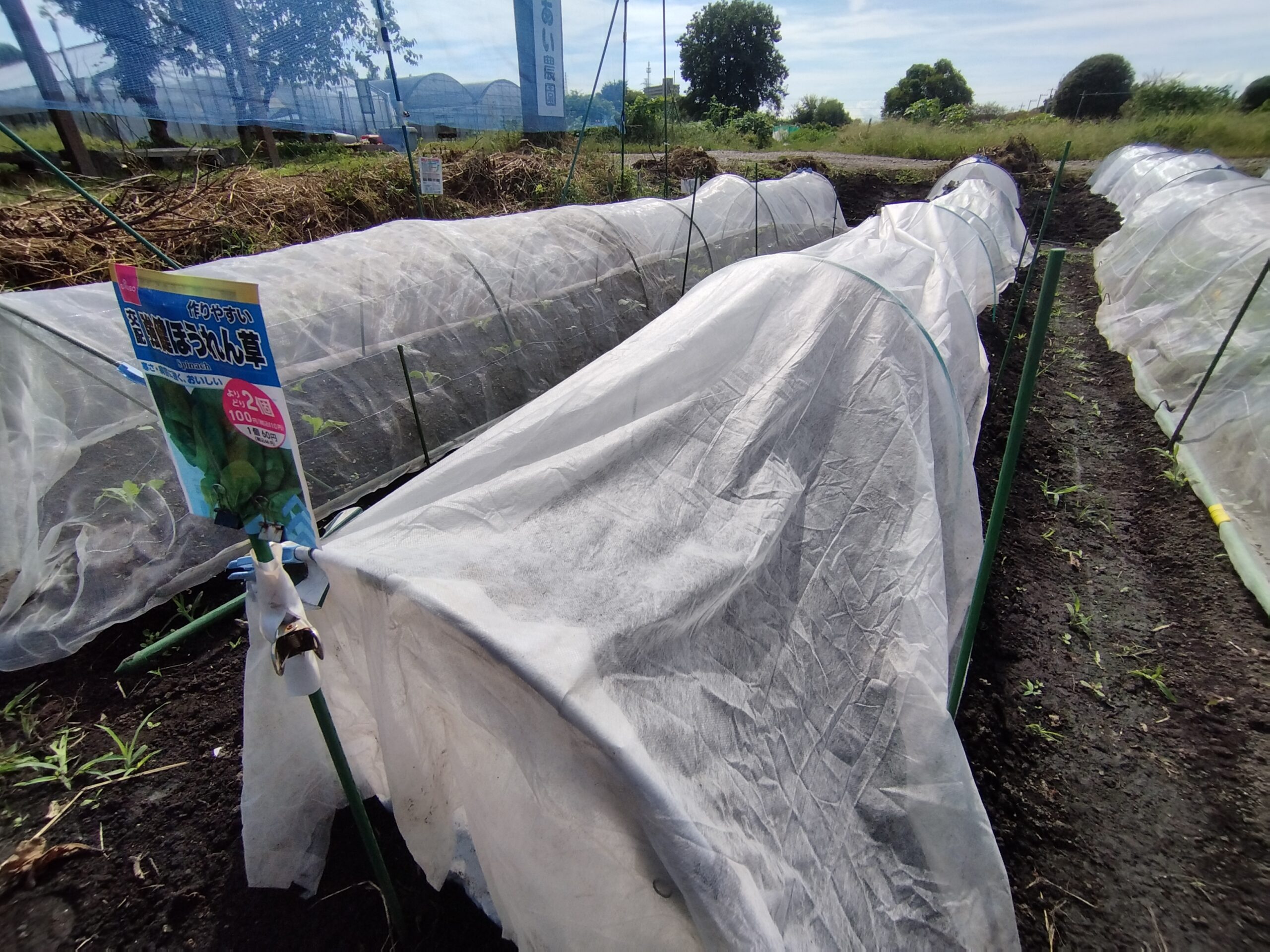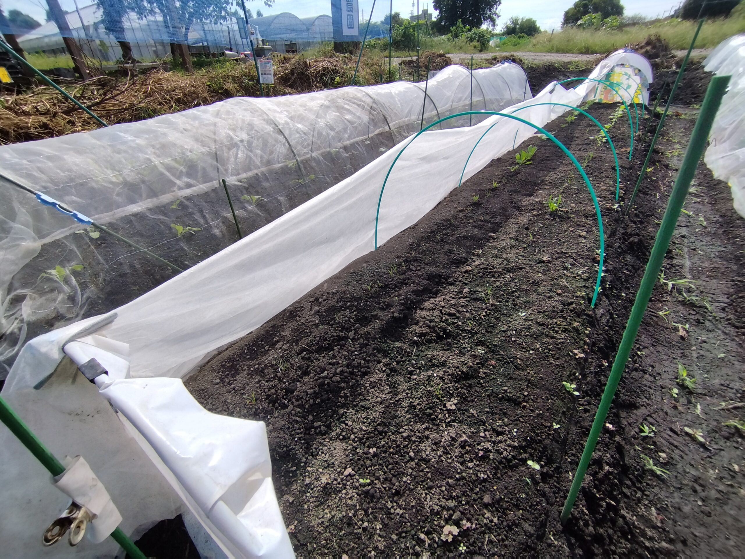 種まきの後、トンネル支柱とダンポールを使って虫対策と日よけ、寒さ対策のために不織布をかぶせました
