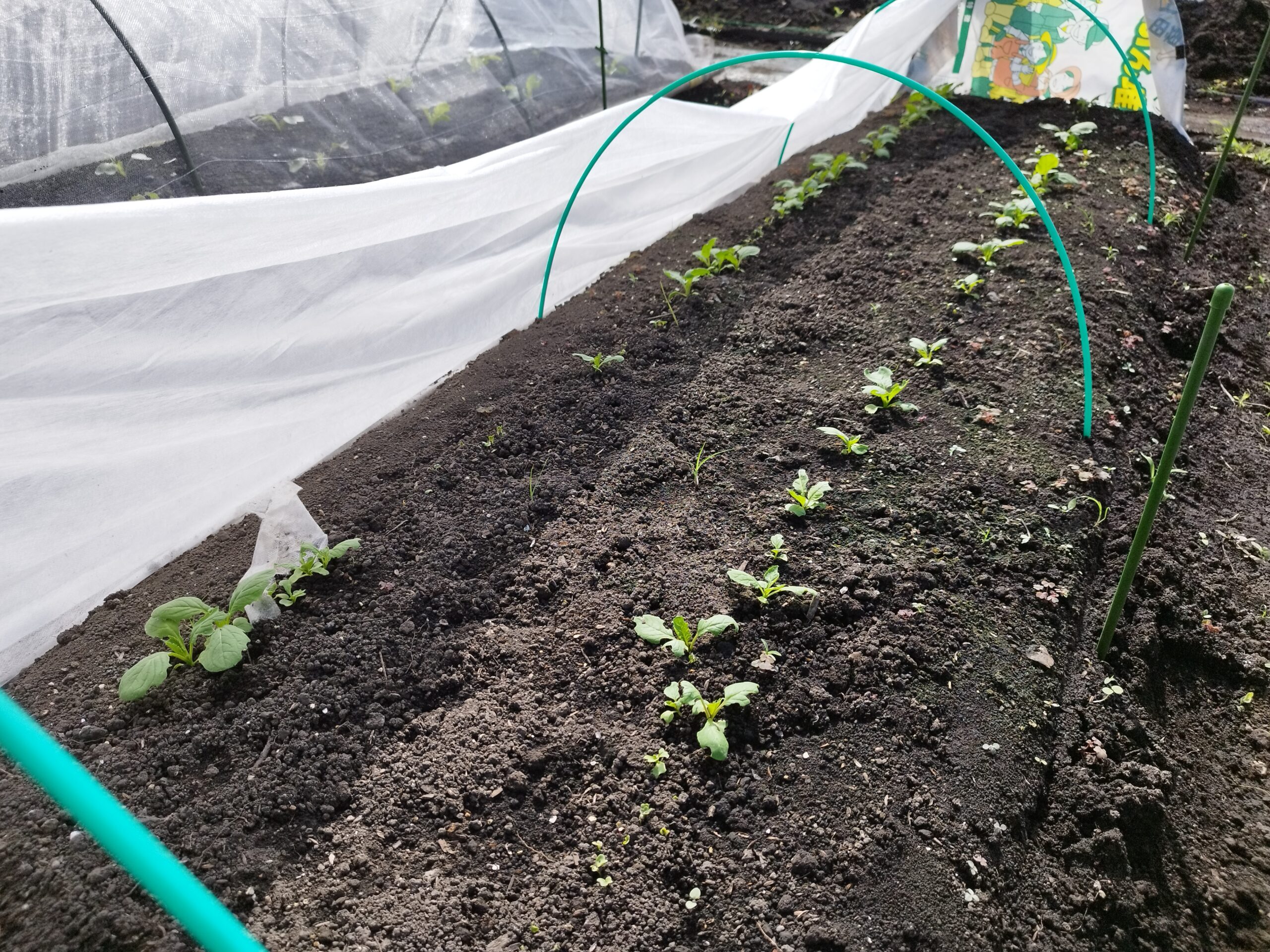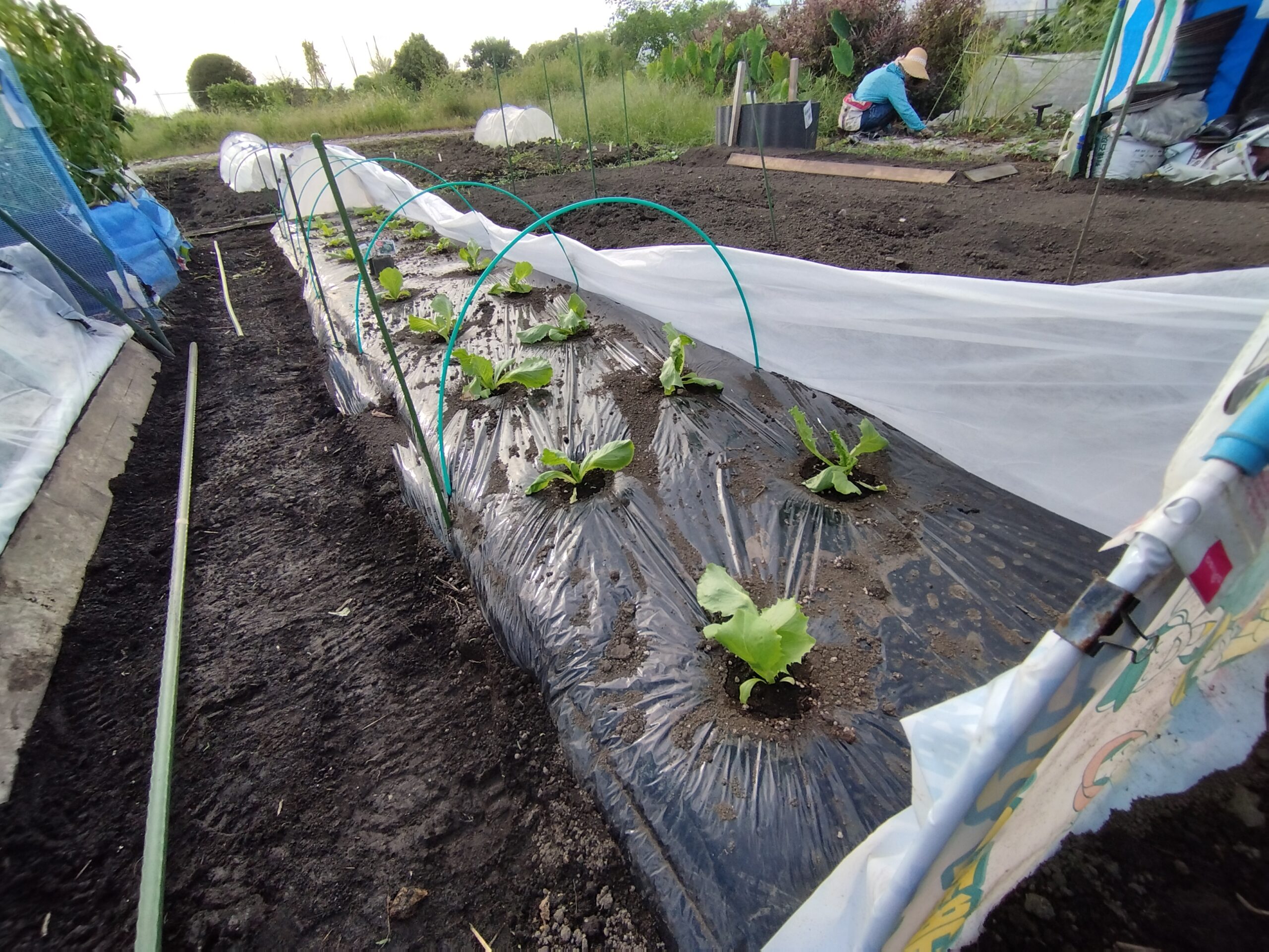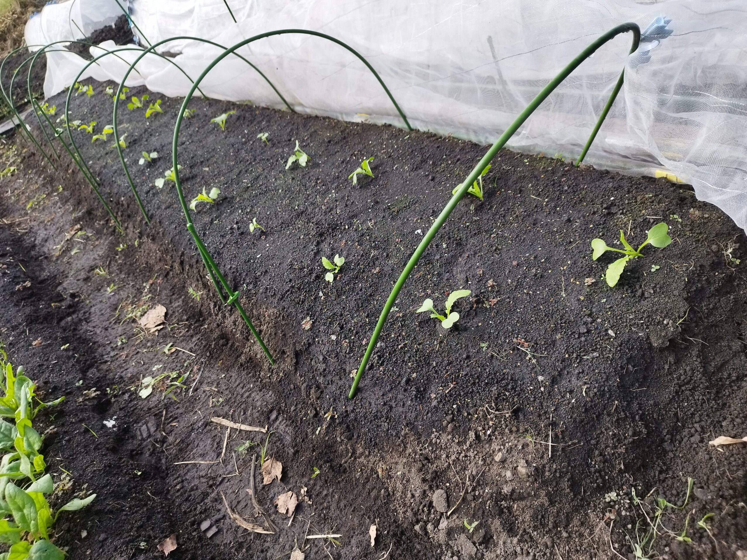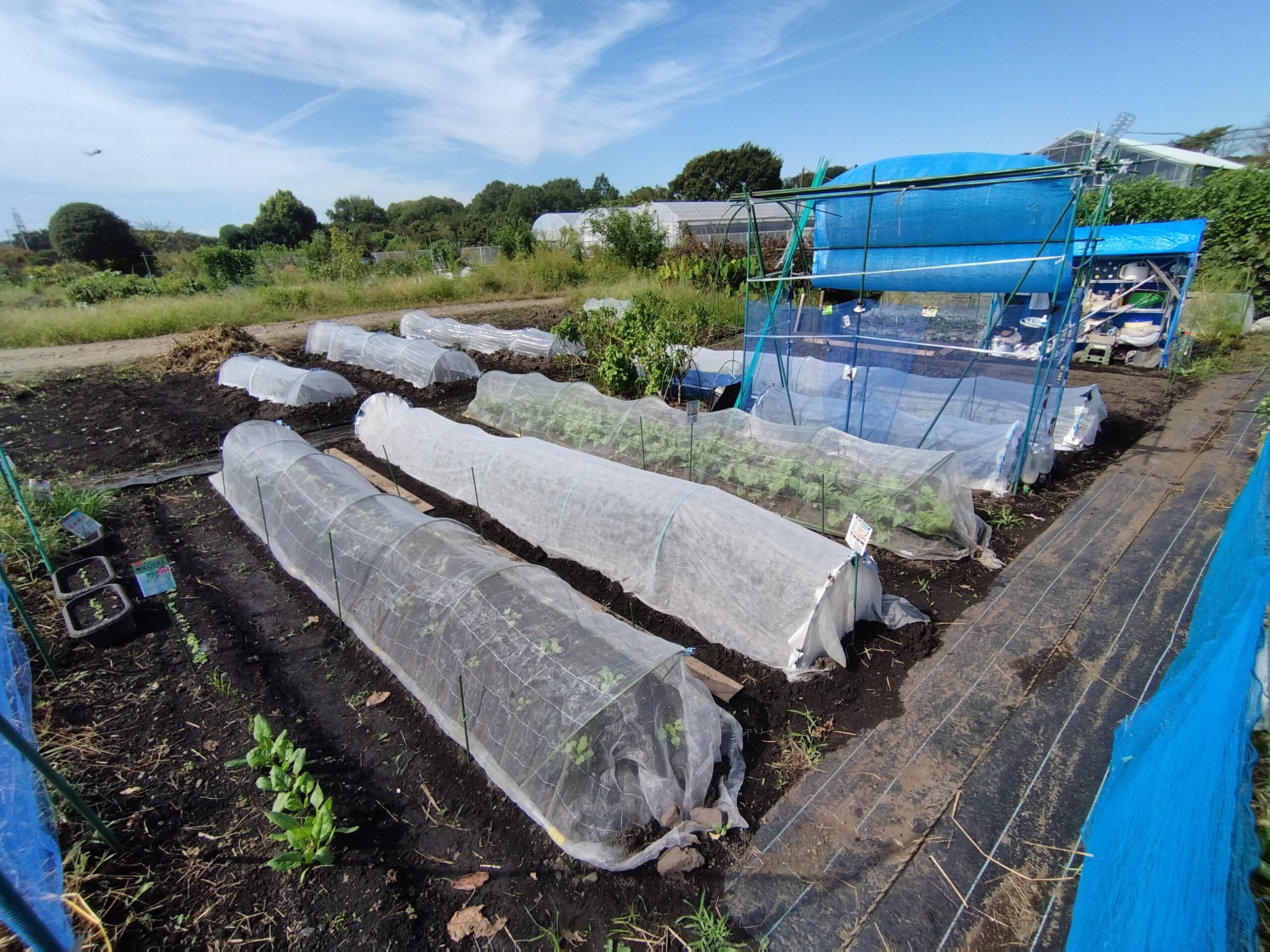 種まきの後、トンネル支柱とダンポールを使って虫対策と日よけ、寒さ対策のために不織布をかぶせました