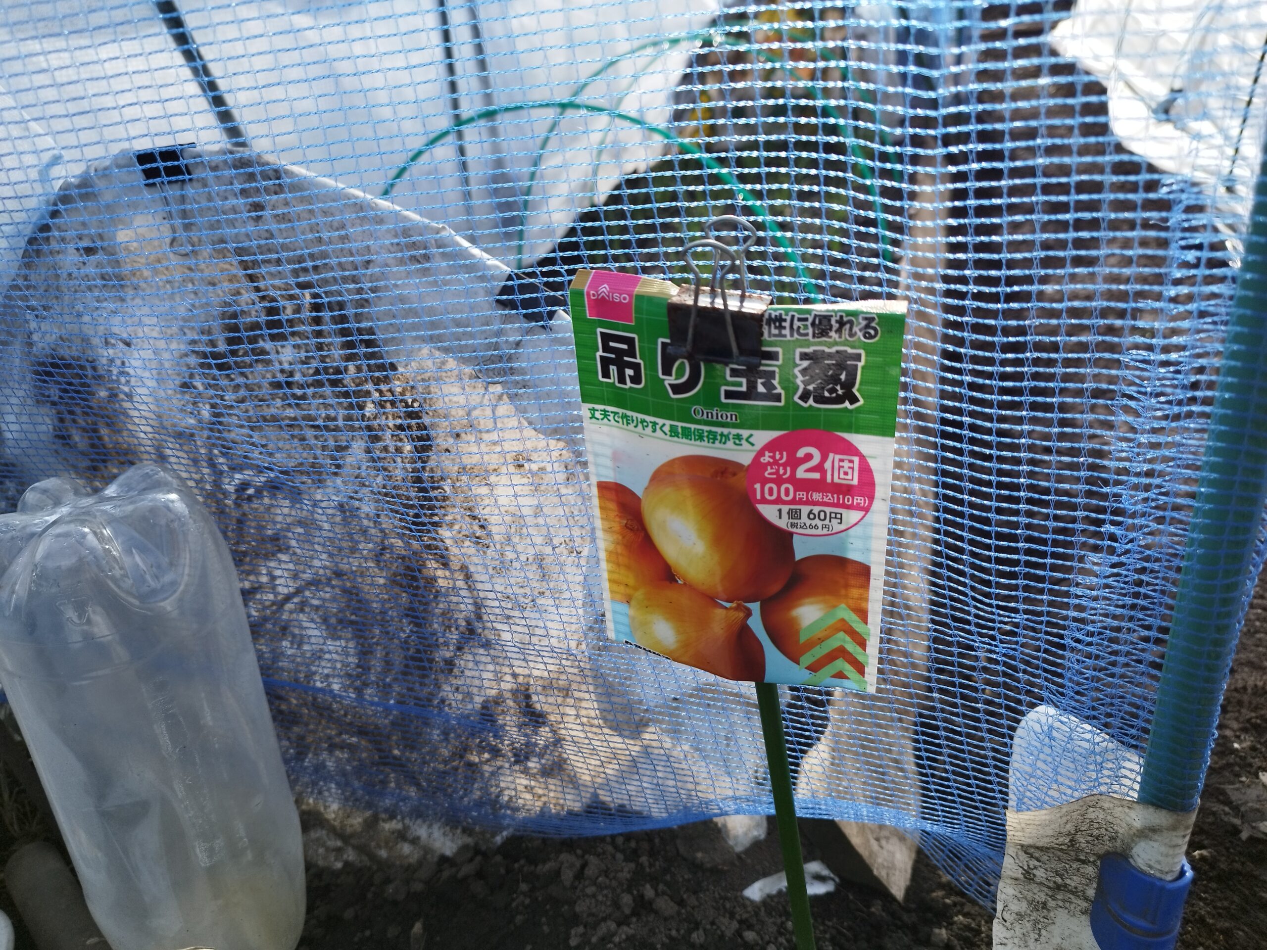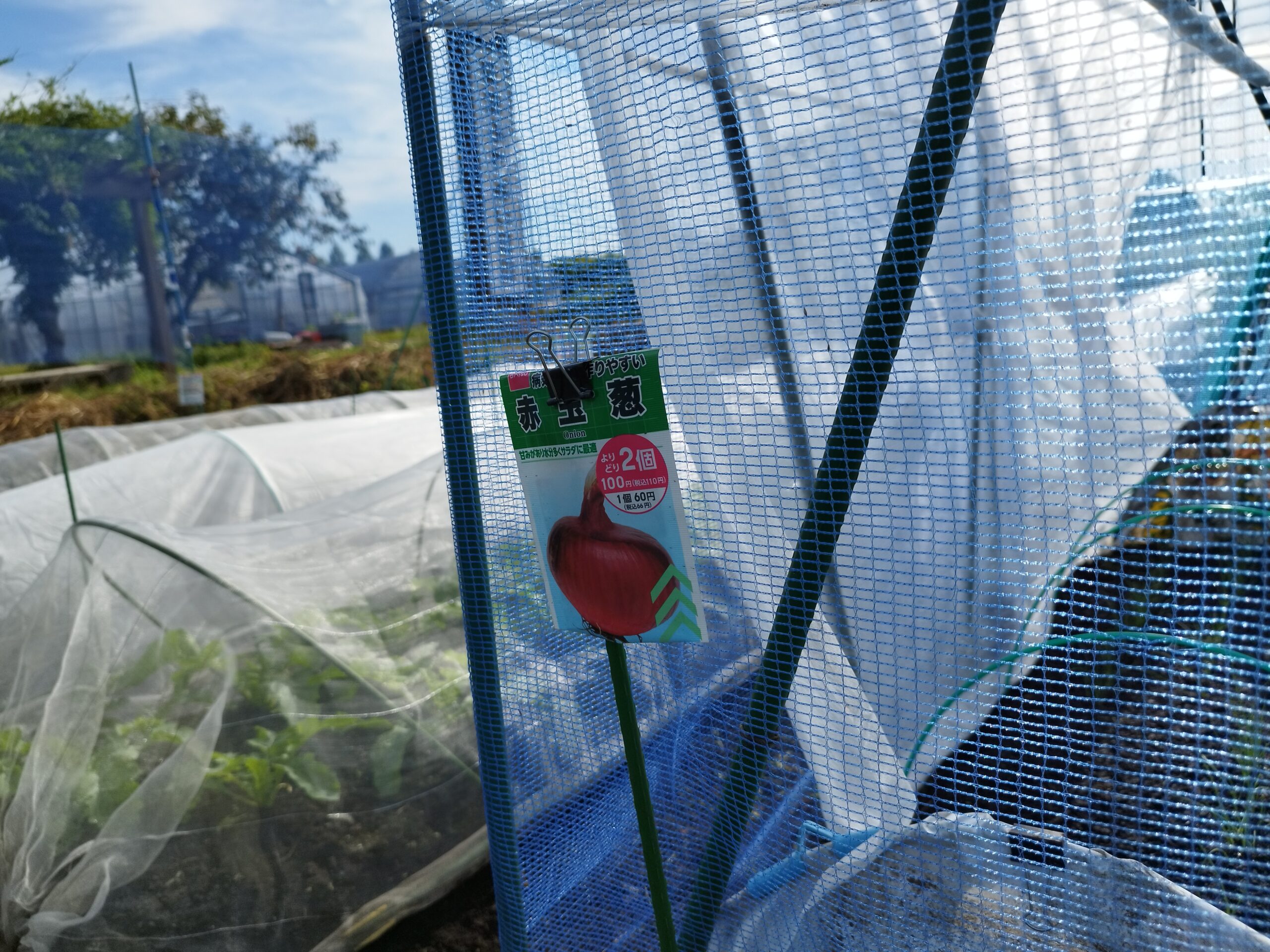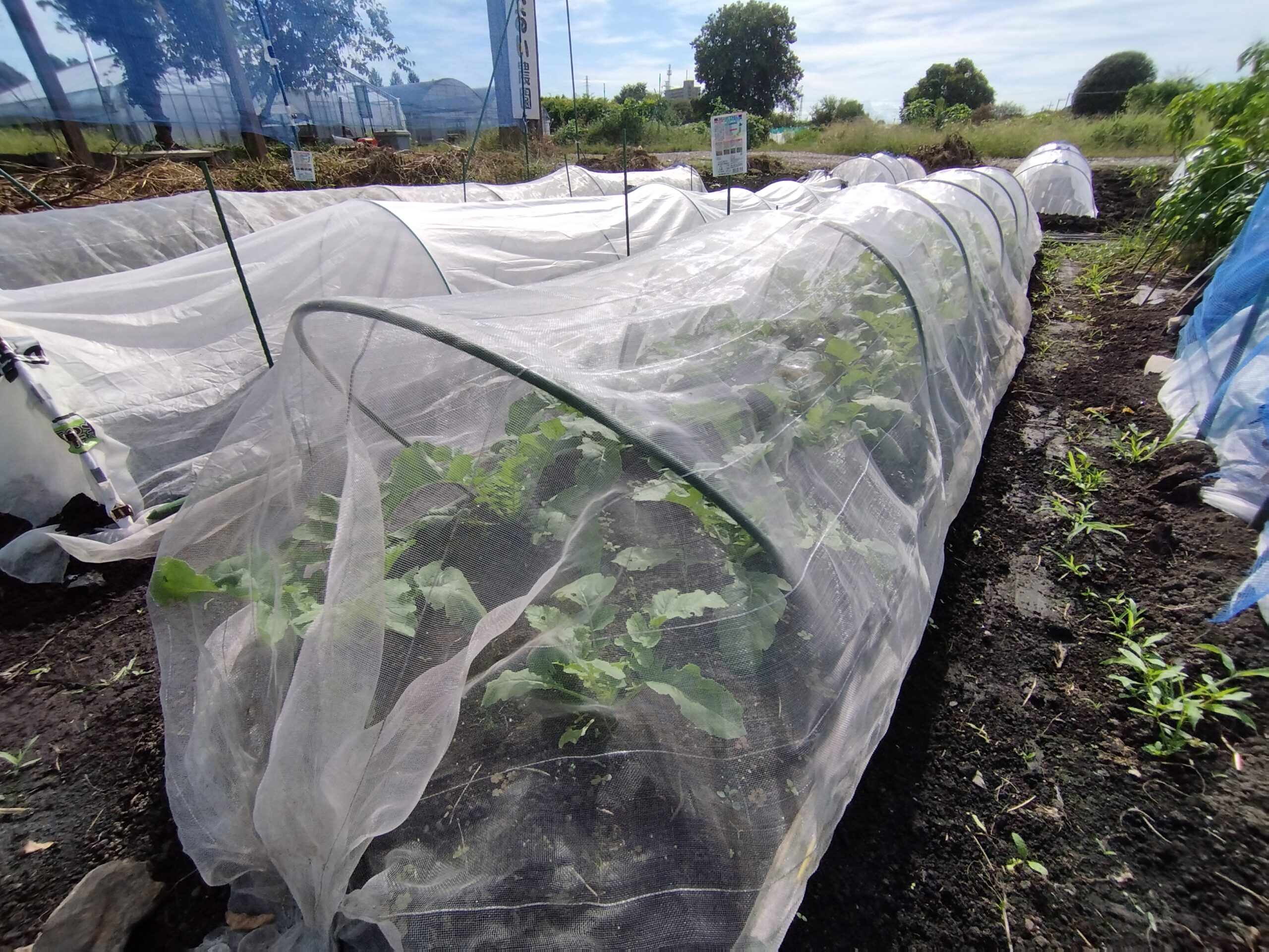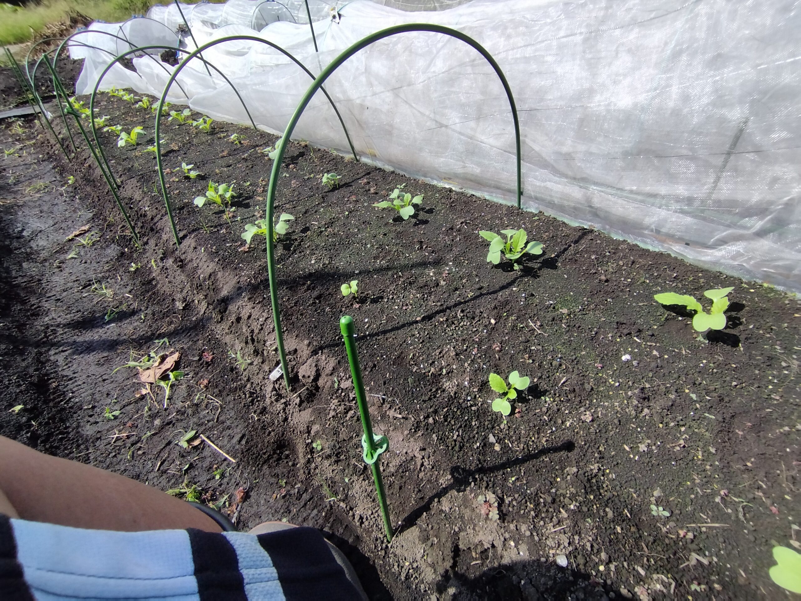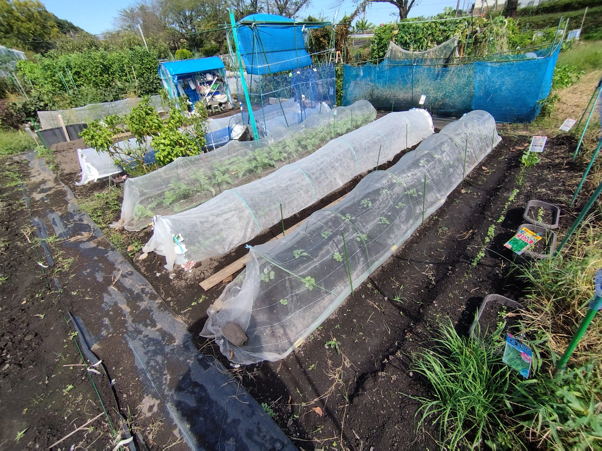 種まきの後,トンネル支柱とダンポールをさして防虫ネットをかぶせました