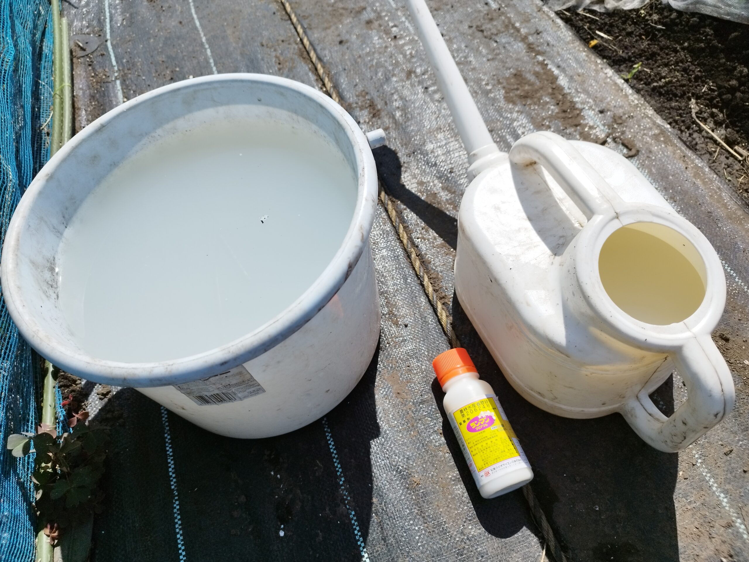 6リットルのバケツに3 CCのランマンフロアブルを入れてかき混ぜてジョーロに移して散水します