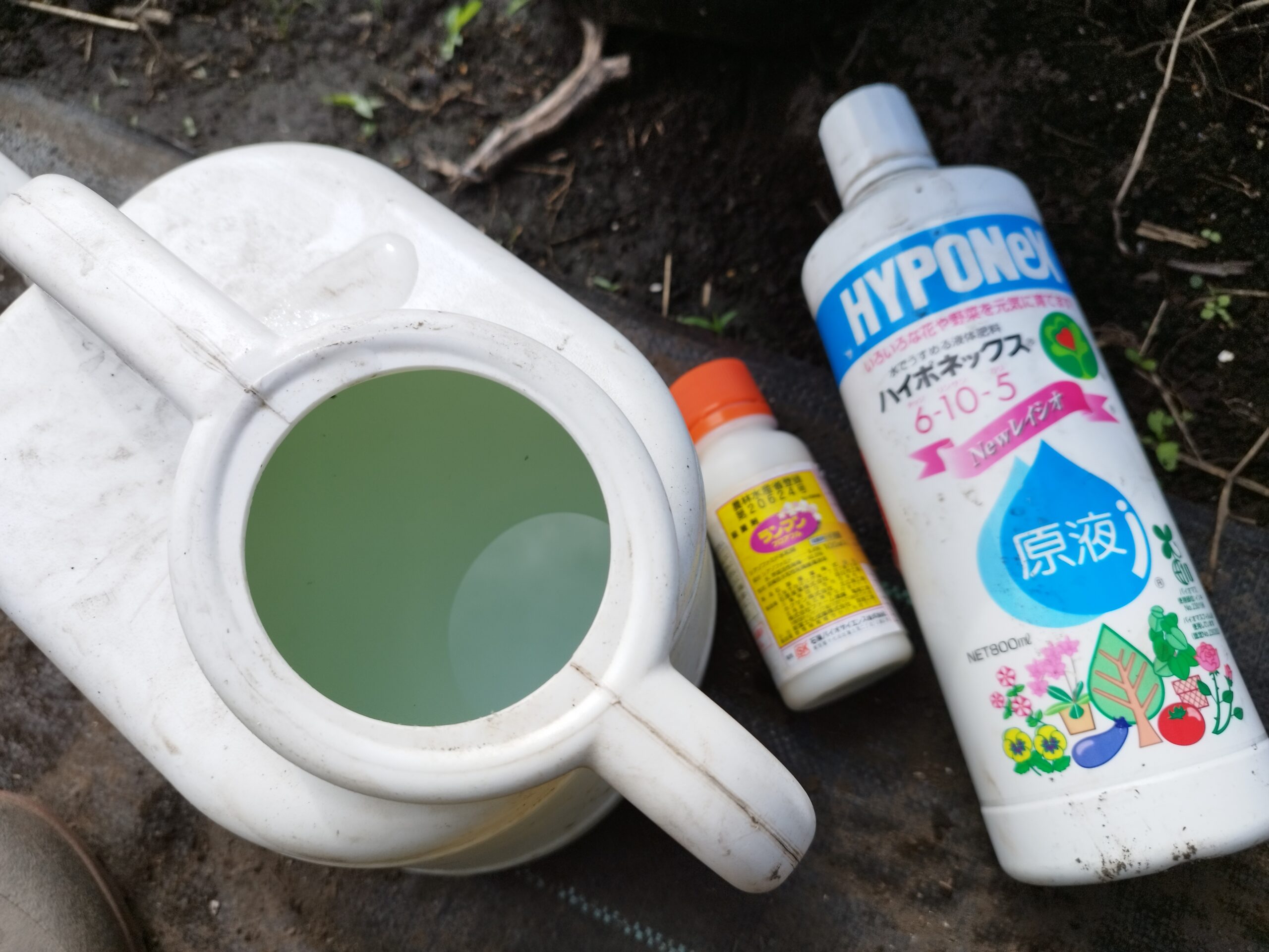 それぞれの野菜の種まきの後に生育促進のために500倍に薄めたハイポネックスとリキダスを3日おき位にジョーロで散布しています