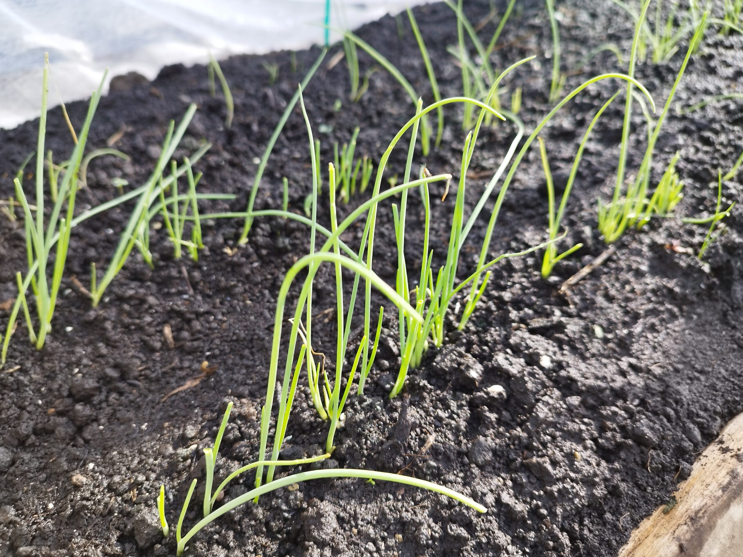 道路側の0番畝には手前からほうれん草,小かぶ,小松菜,ニラといろいろ植えてます