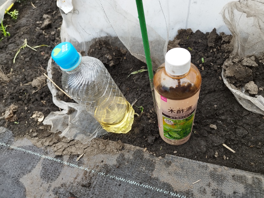 防虫ネットを取り外したついでに木酢液と特製の酢の防虫溶剤を1000倍に薄めて大根にジョーロを使って散布します
