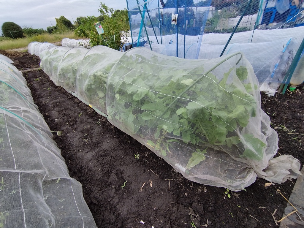 外した防虫ネットは、大根のすぐ横に210センチの支柱を立て防虫ネットを支柱パッカーを使って防風ネットがわりに設置しました
