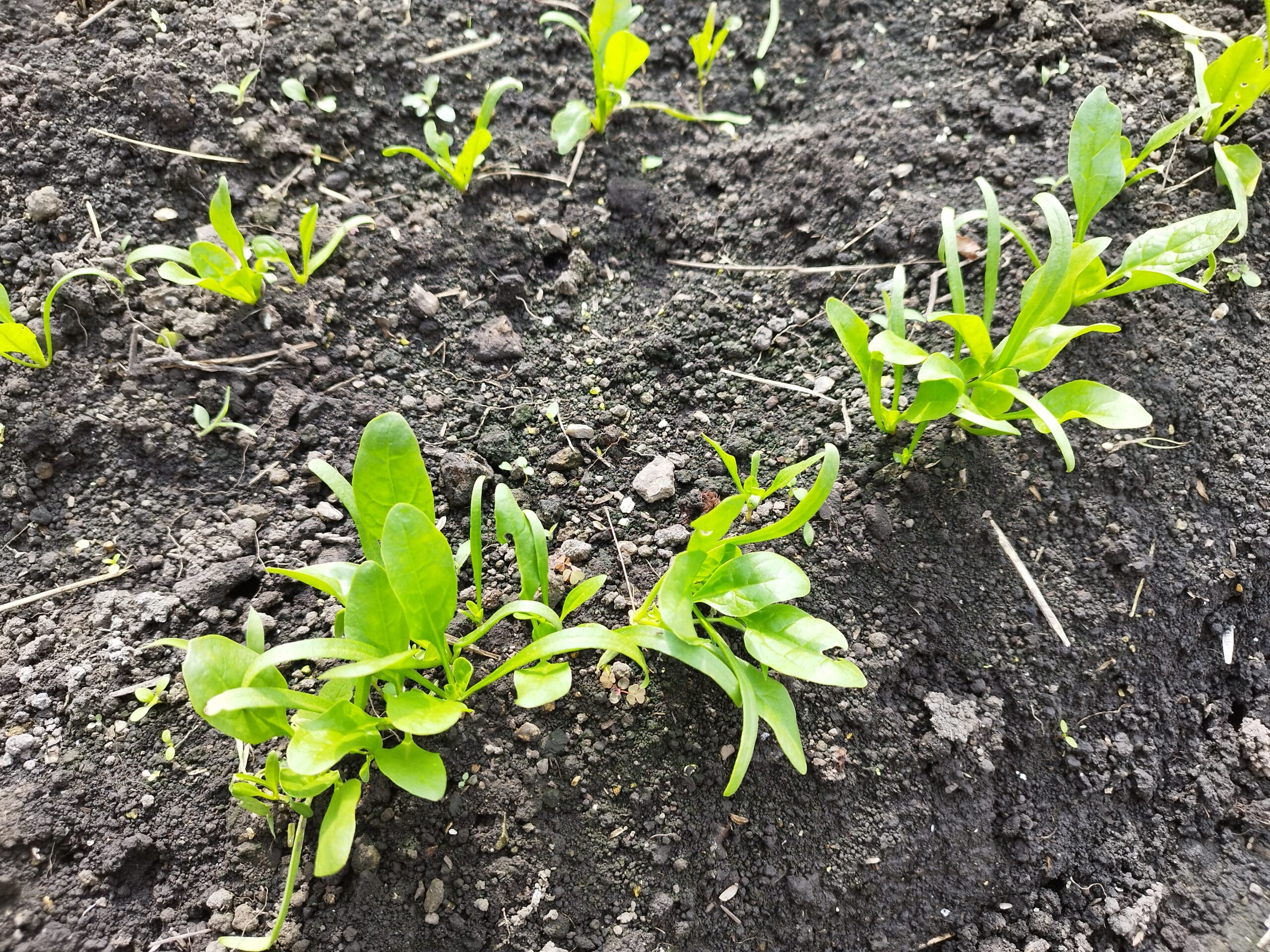 ご覧のように、ほうれん草が歯抜けのように芽が出ていないところと固まって発芽しているところがあります