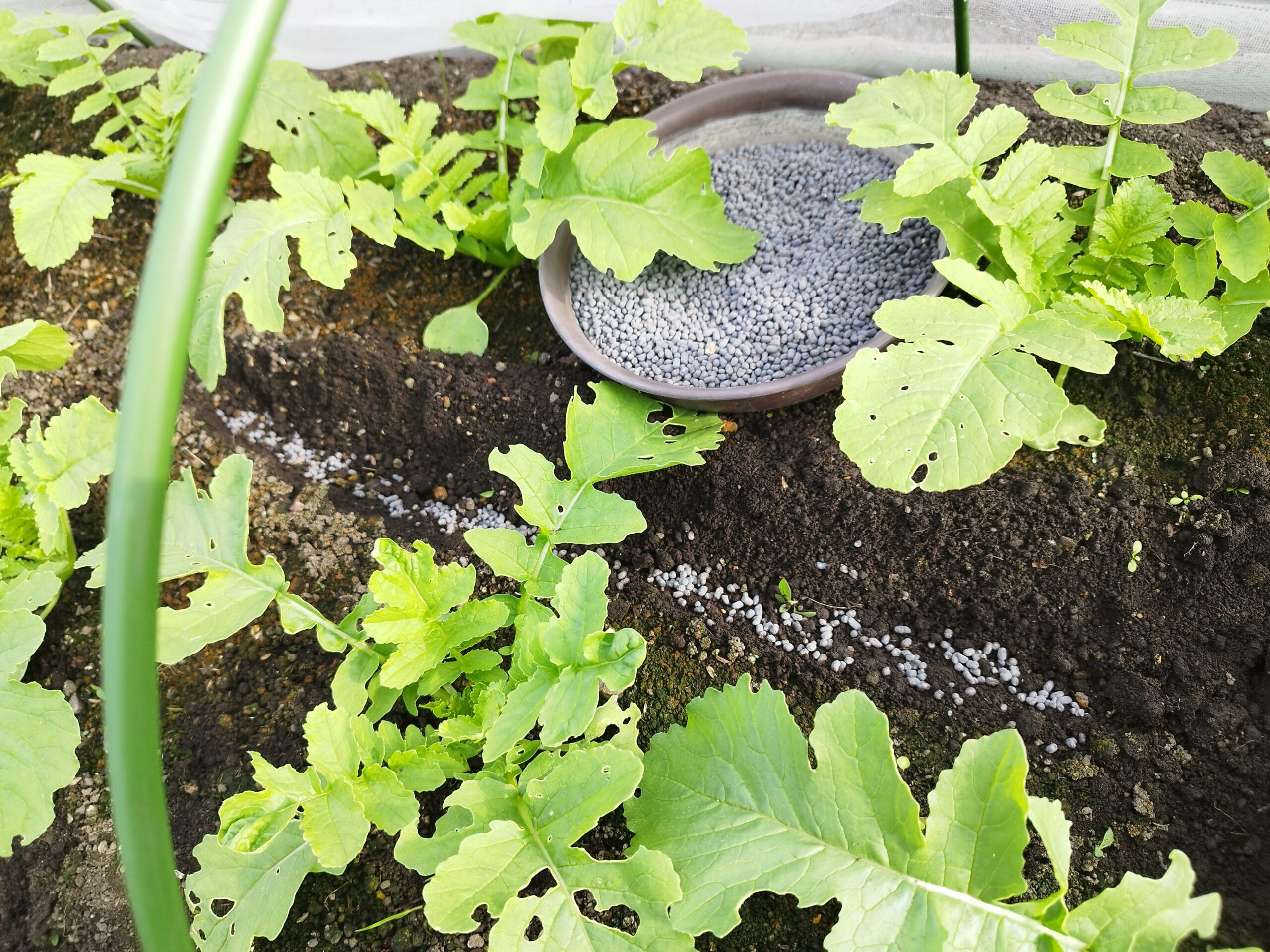 大根の苗と苗の間に溝を掘りそこに有機化成肥料をまいてそのあとまた土をかぶせておきます
