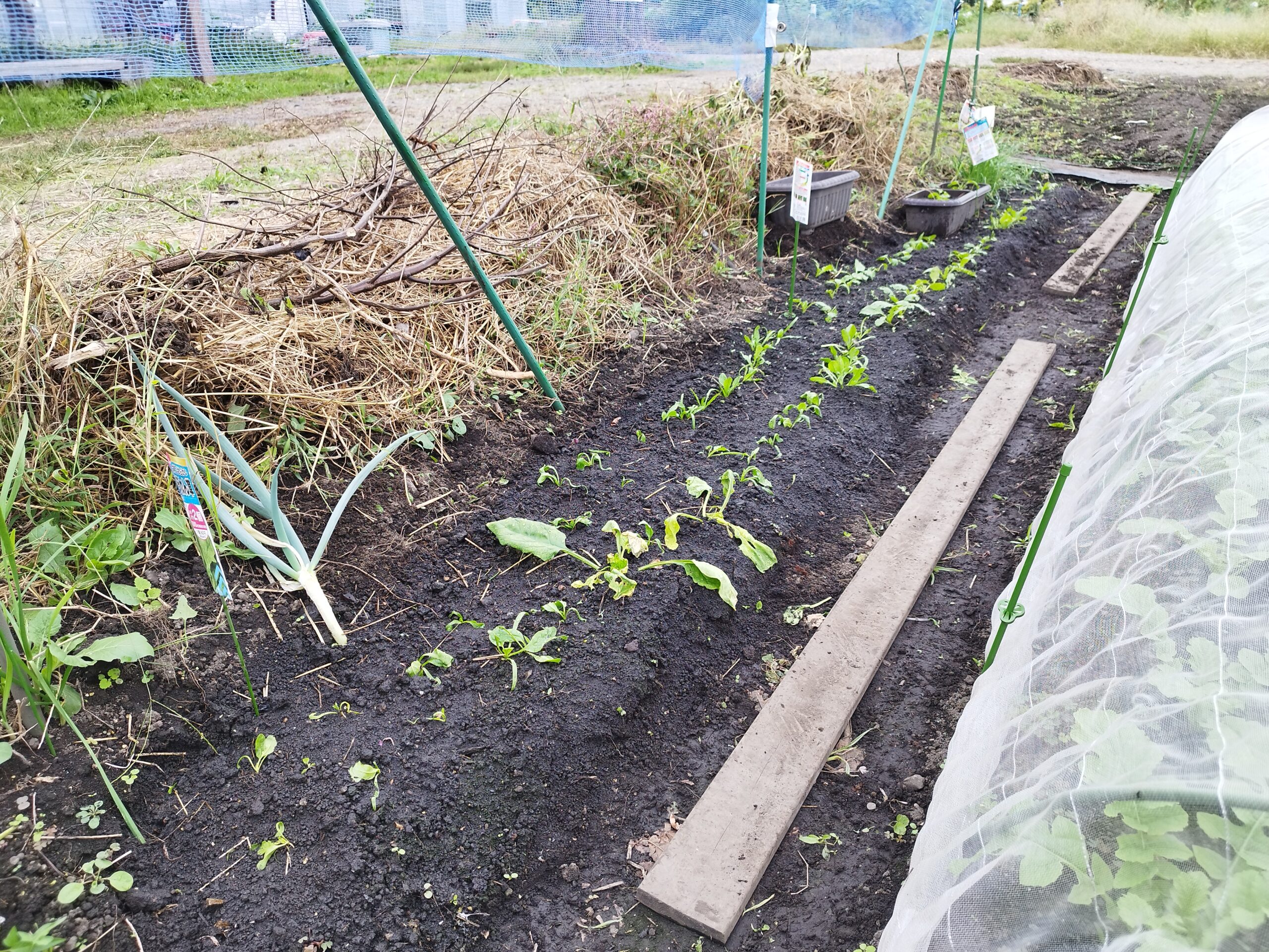2番畝には、ほうれん草と小松菜を半分ずつ植えています