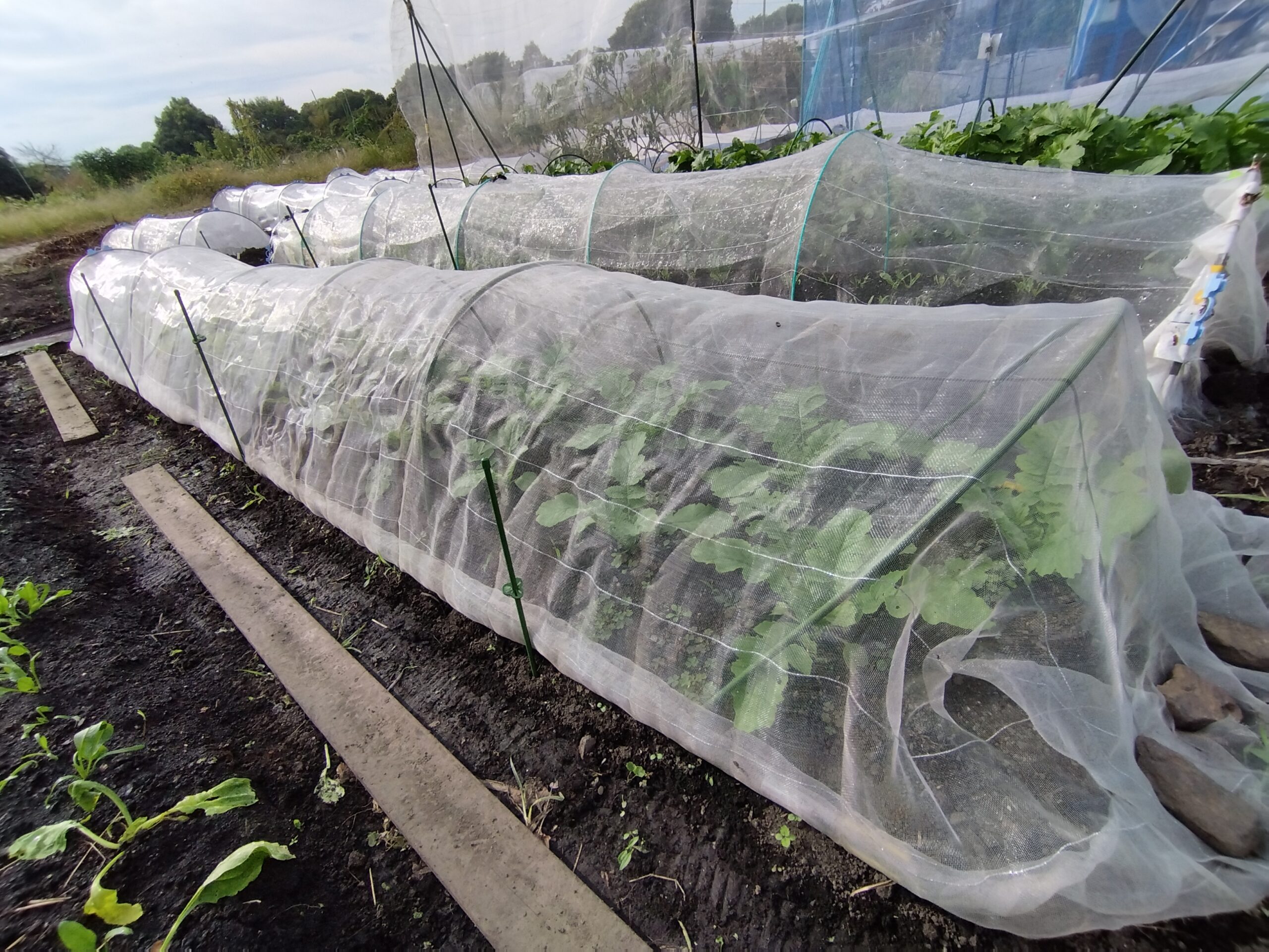 - 1番畝の2番植えの大根にかぶせている防虫ネットを撤去と虫除け薬剤を散布