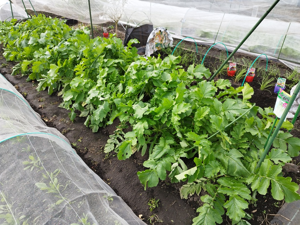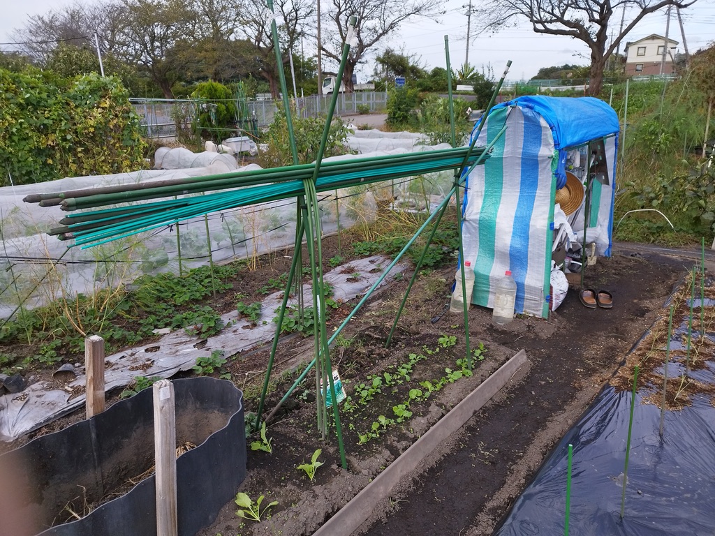 〜資材置き場と支柱置き場を兼ねて支柱の下に小松菜と大根4株、植えています