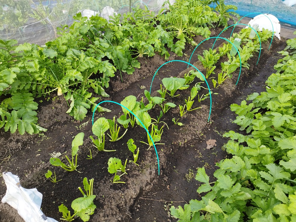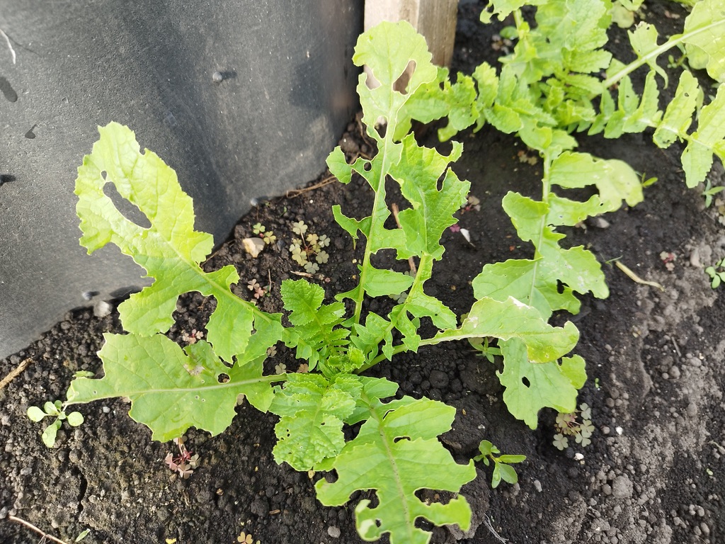 ここの畝も同じように木酢液と鷹の目とニンニクを配合した特製のお酢を散布しているのですが大根と小松菜の葉っぱがだいぶ虫にかじられています