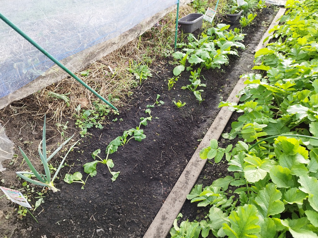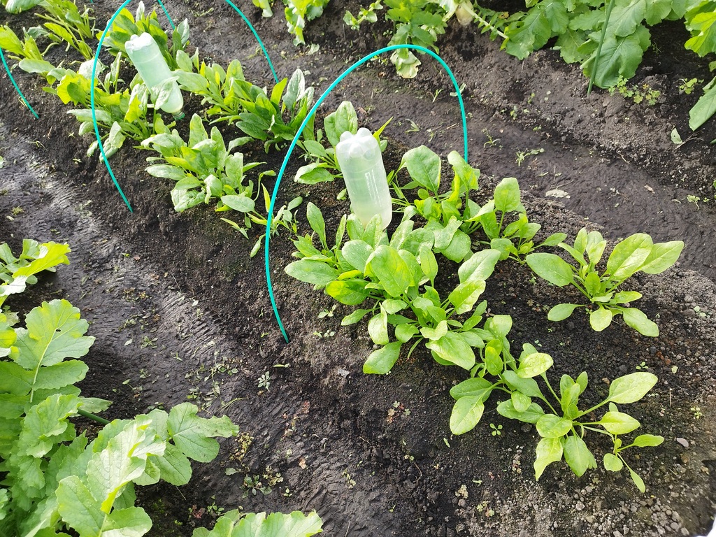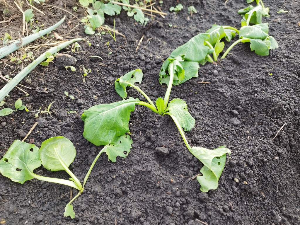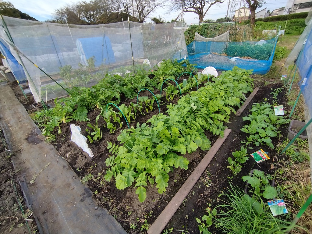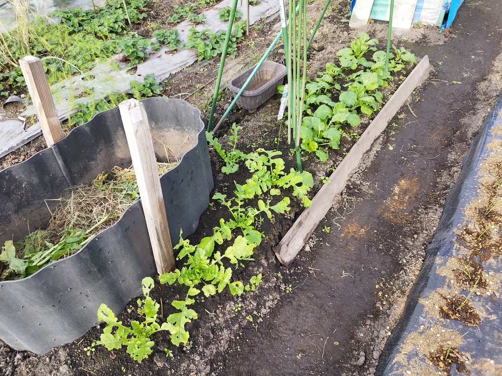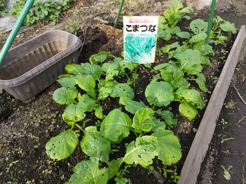 小松菜の葉っぱが虫に食べられているので、それを撤去するためと1部のほうれん草がとても大きくなりそれらを収穫するためです
