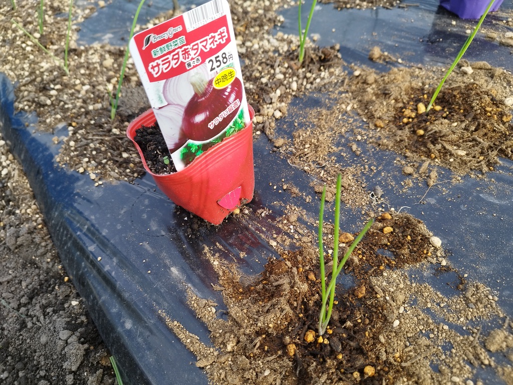 サラダ赤玉ねぎの苗を40個株ほど植え付けました
