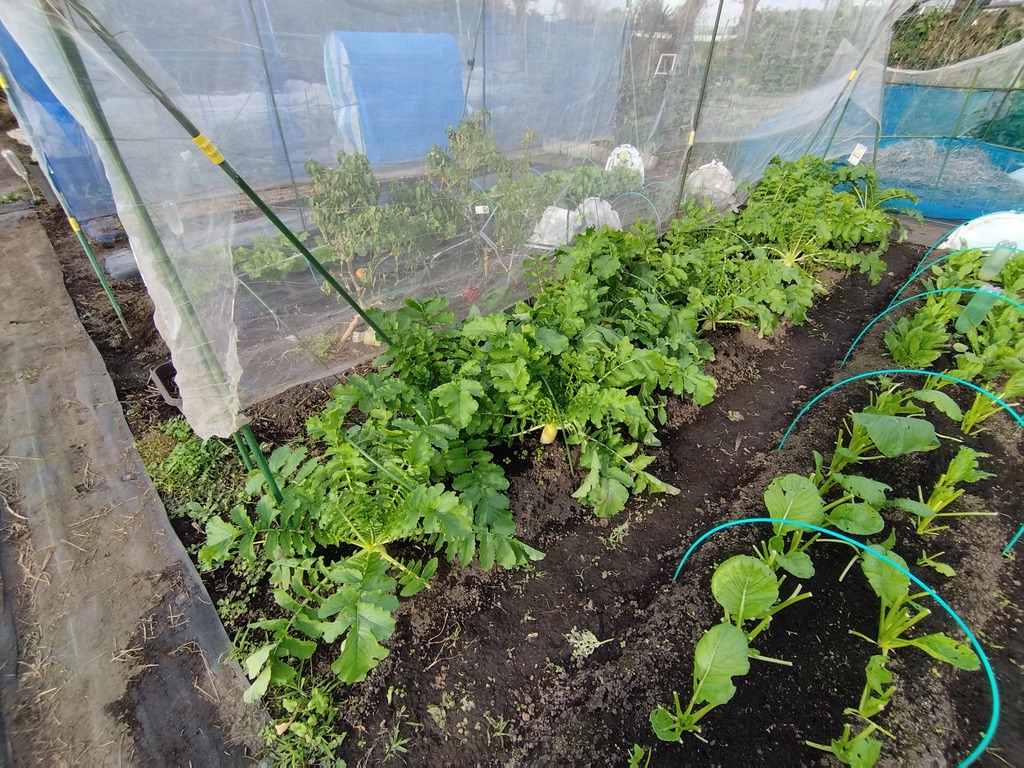 ご覧のようにほうれん草とコマツナを植えている2番畝の防虫ネットも撤去しました