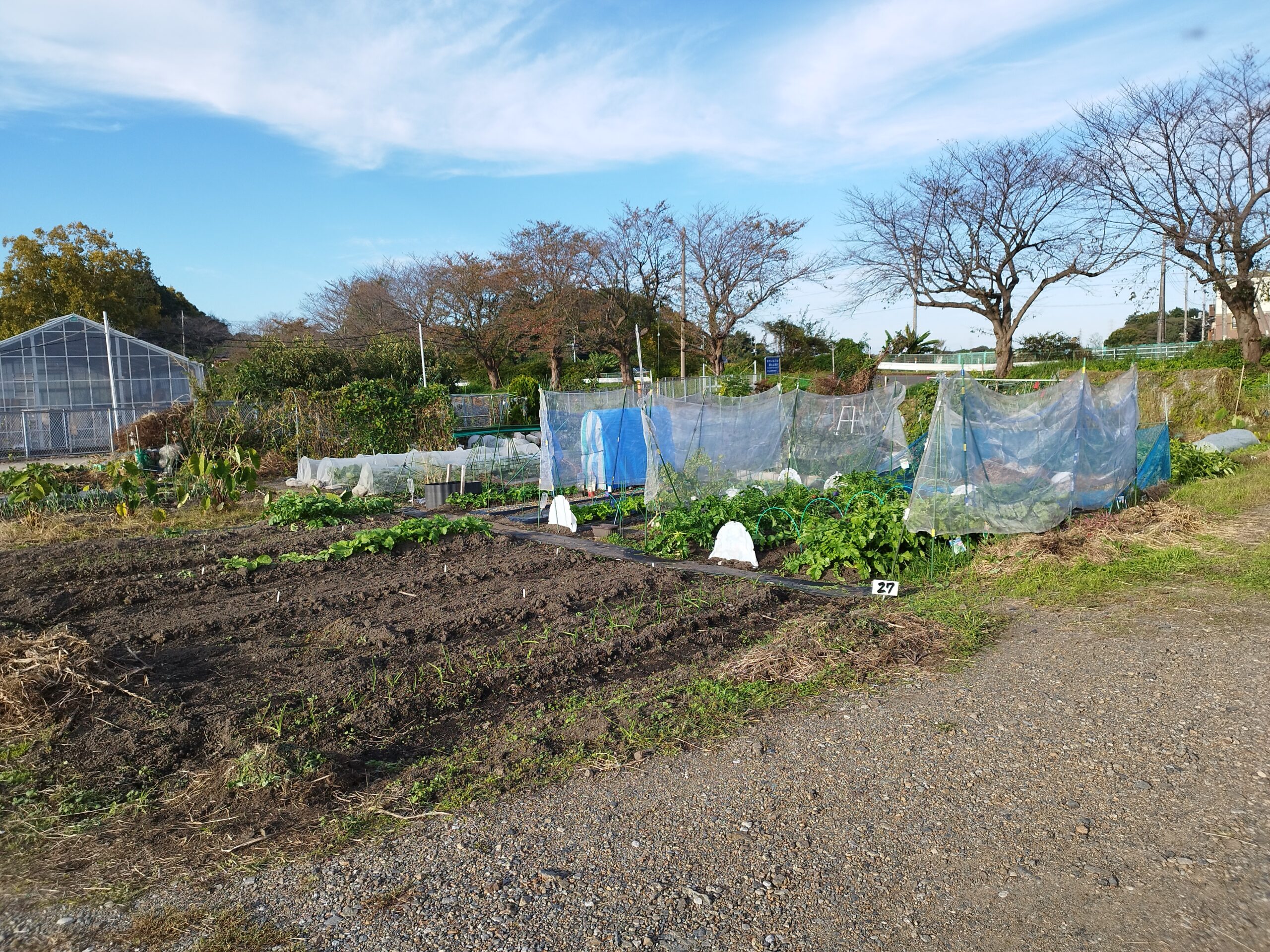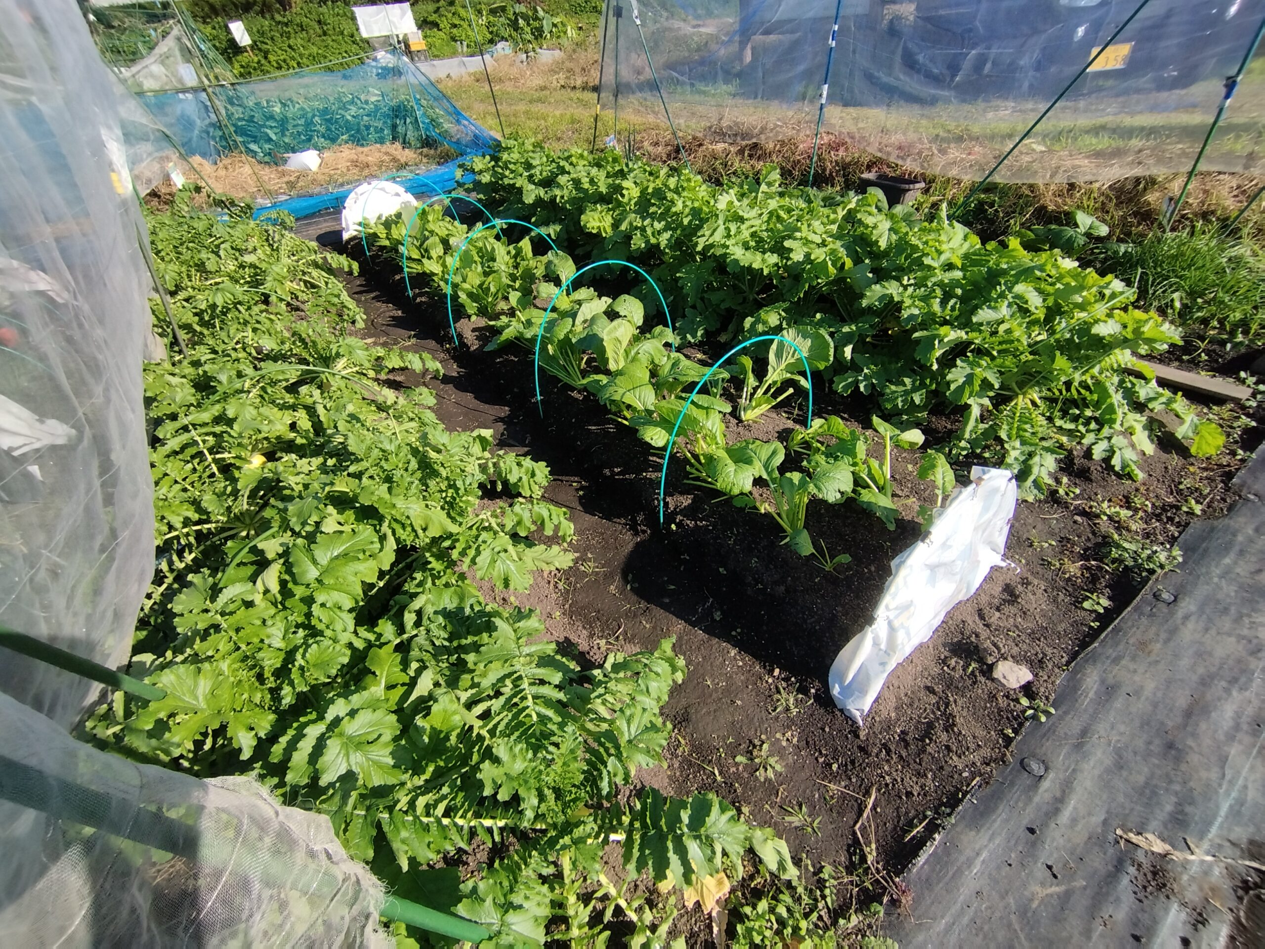 8番畝は資材置き場の隣の畝で手前が小松菜、奥に大根を植えています