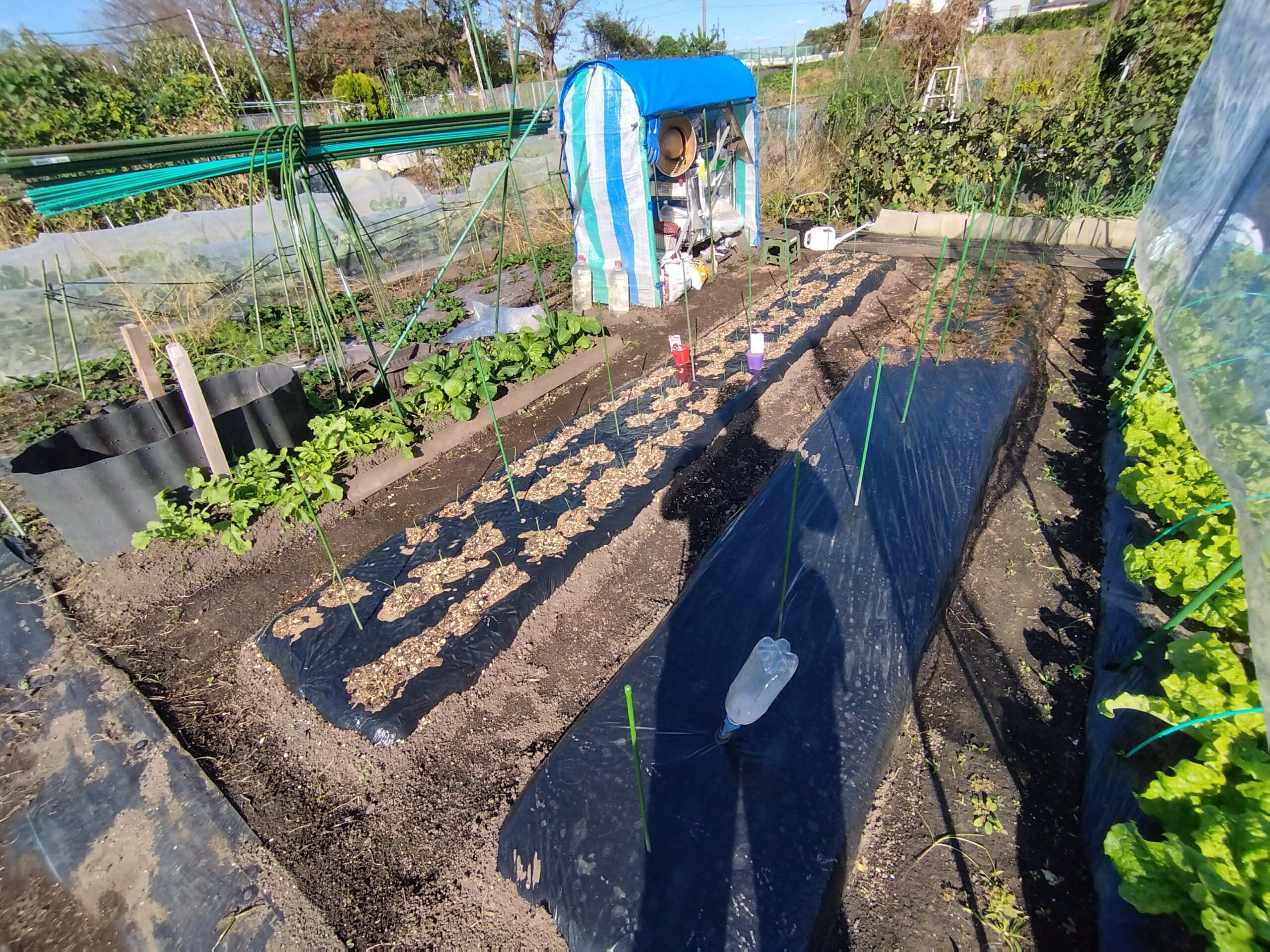 6番畝の手前から半分ほど使って吊り玉ねぎの苗を植え付けしました