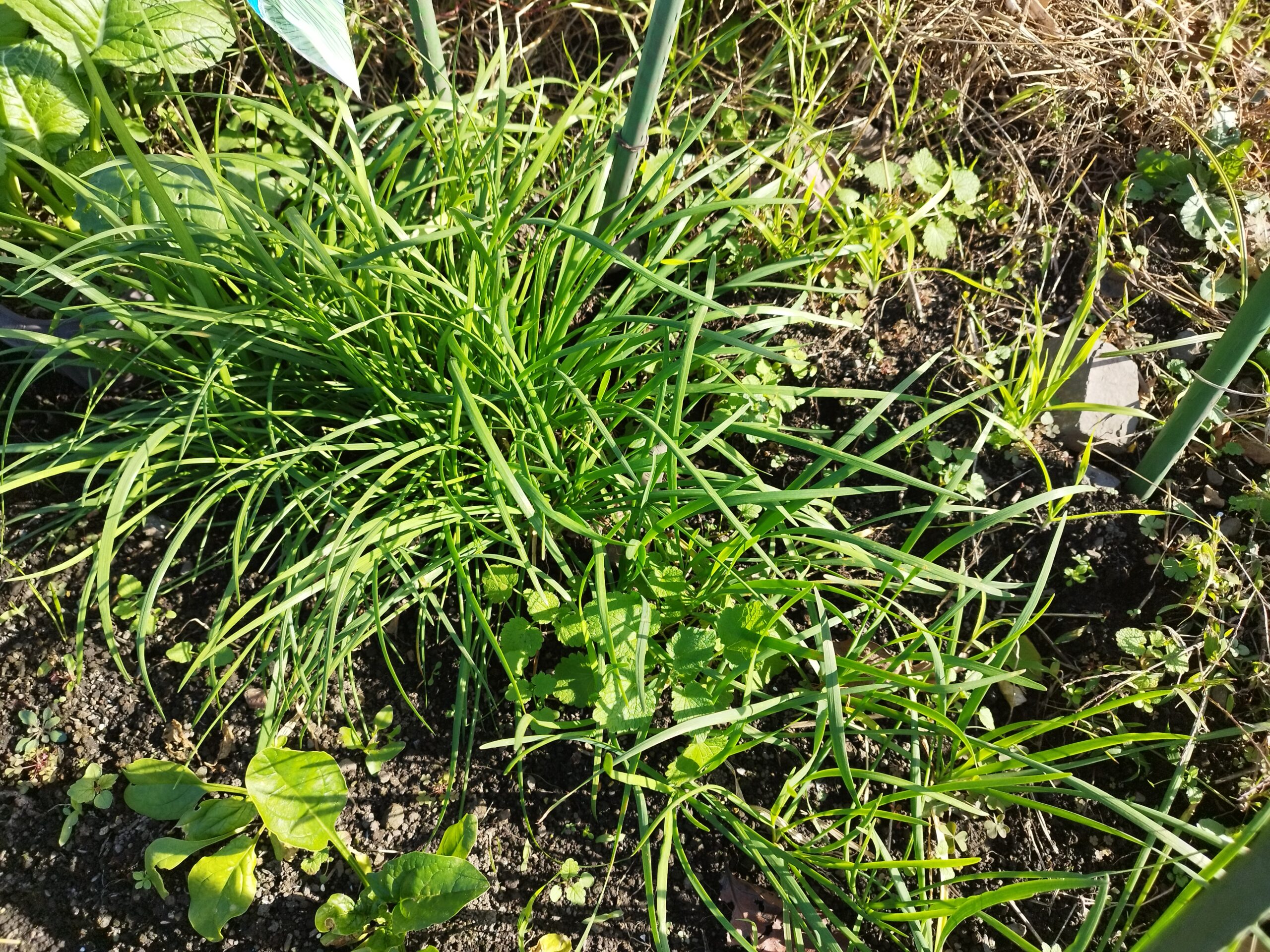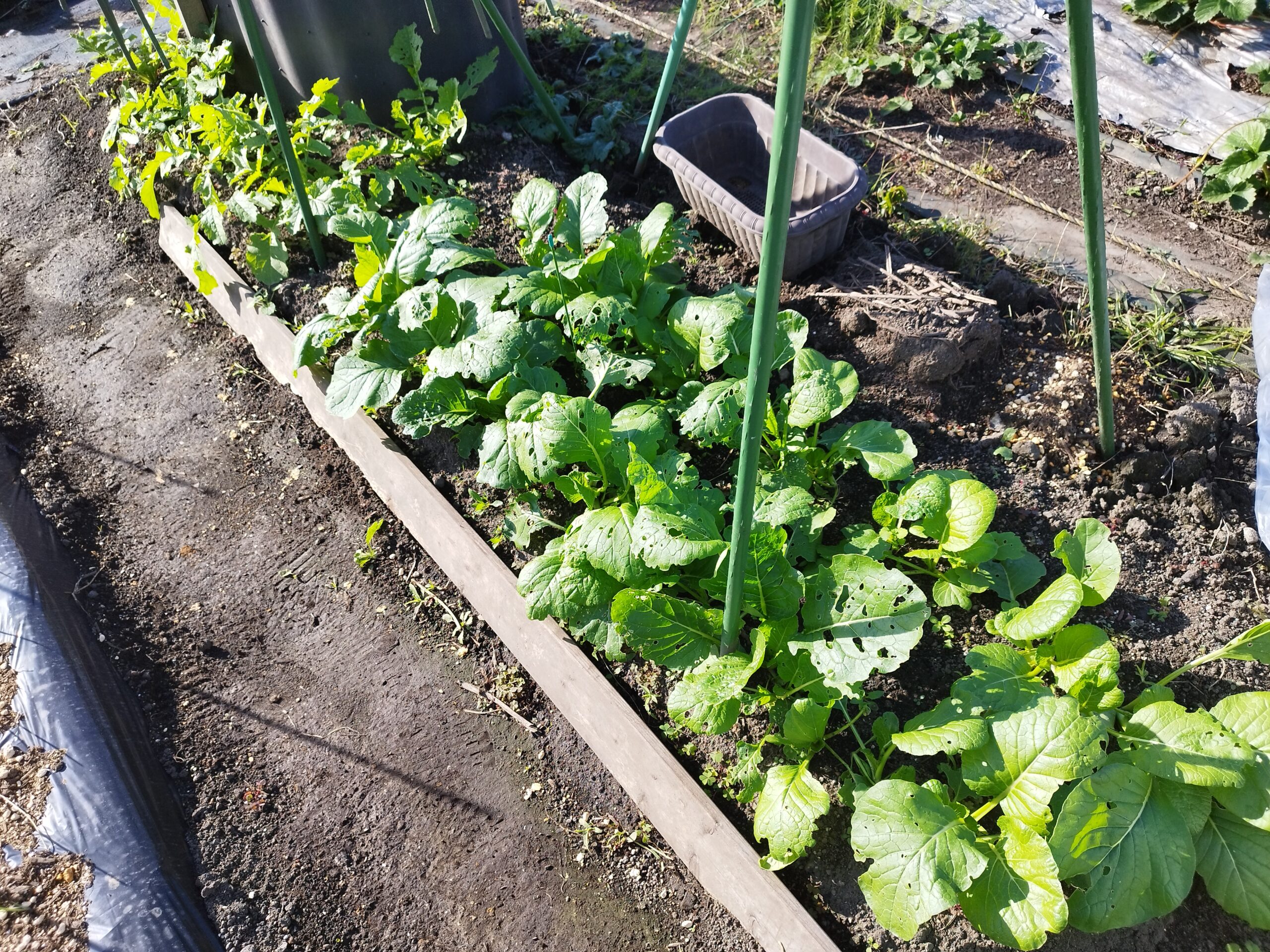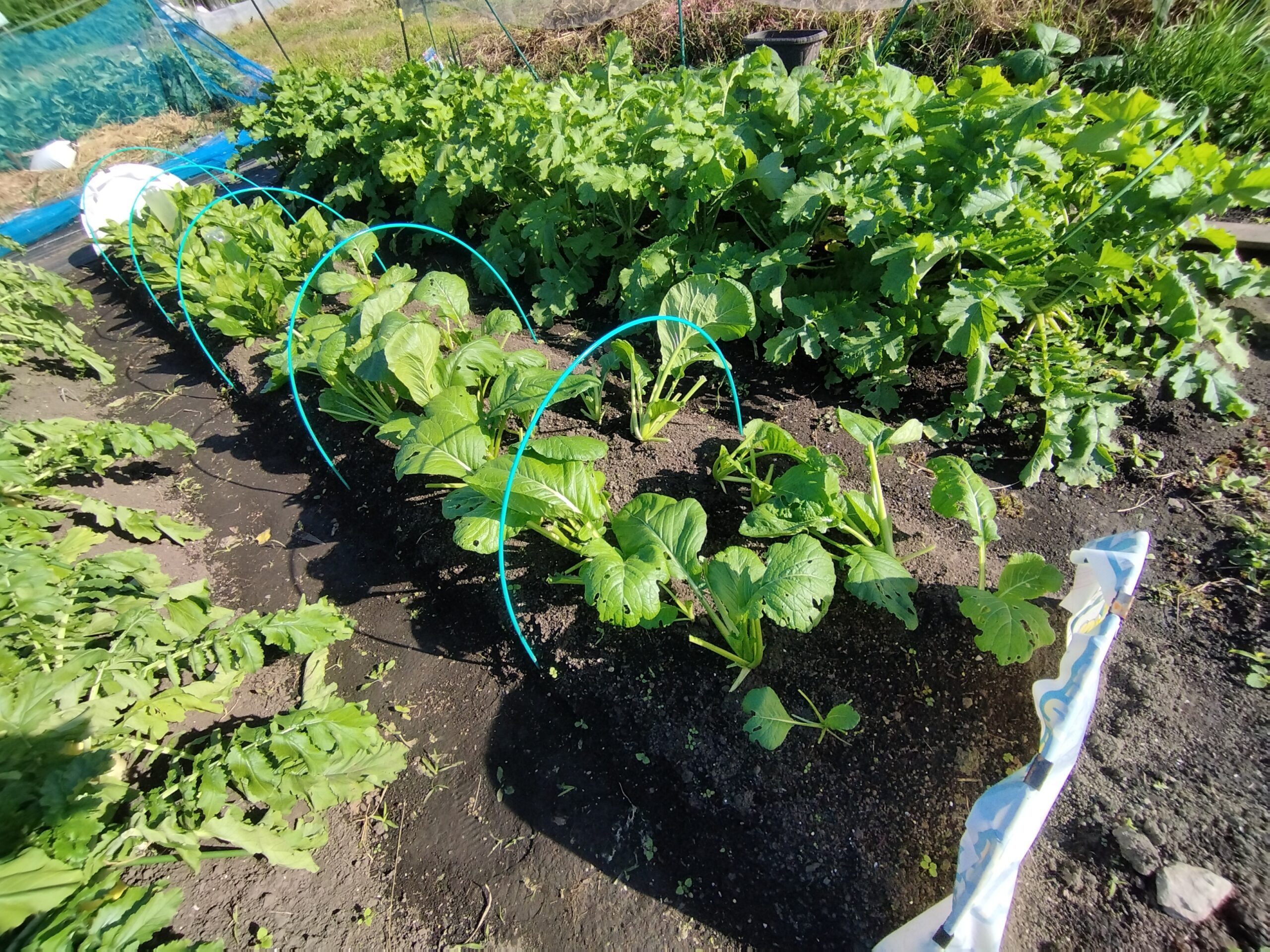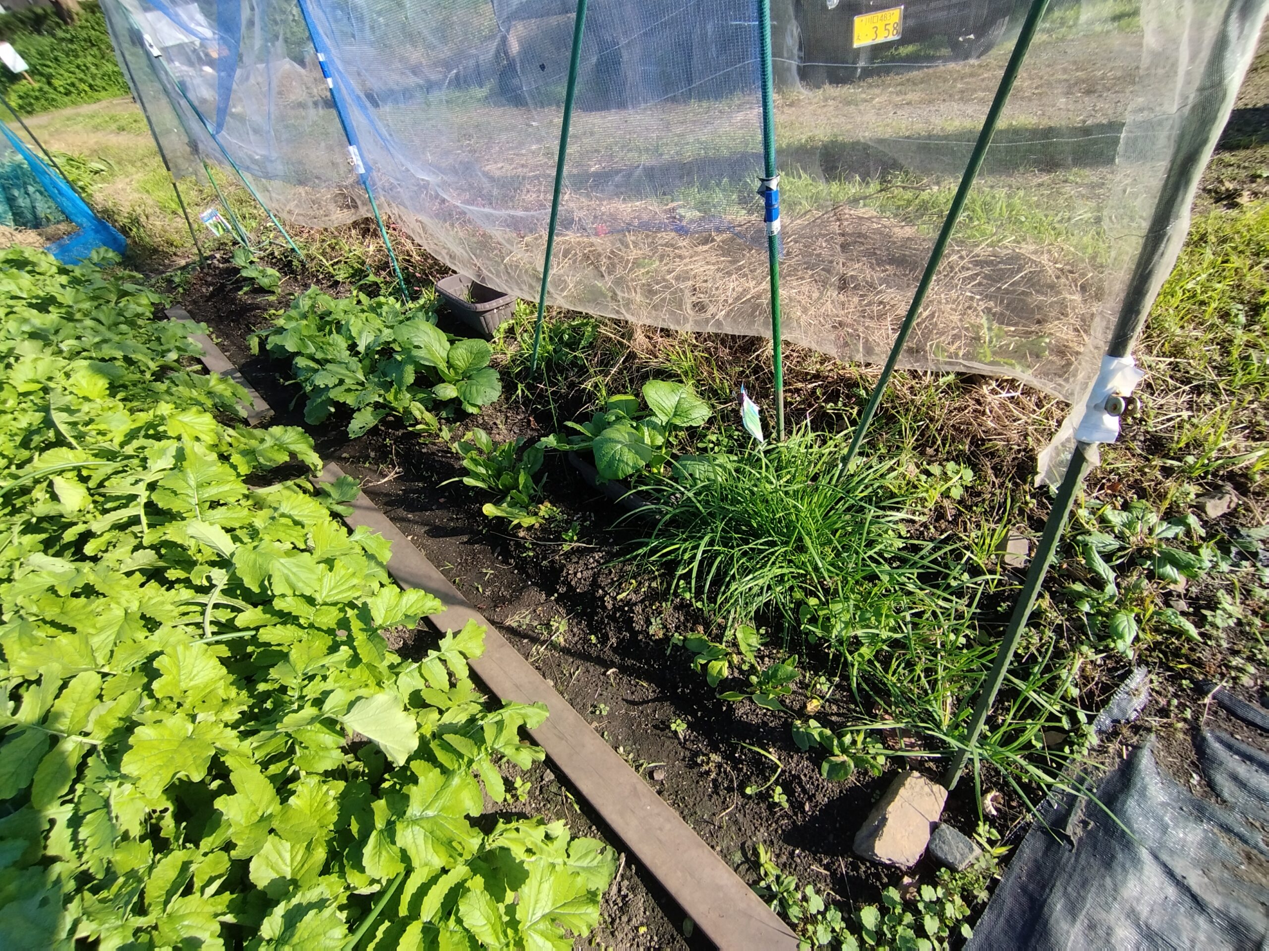 手前から「大葉ニラ」「小松菜」その手前が「ほうれん草」そしてその奥が「小カブ」「ほうれん」「草ネギ」と混植しています