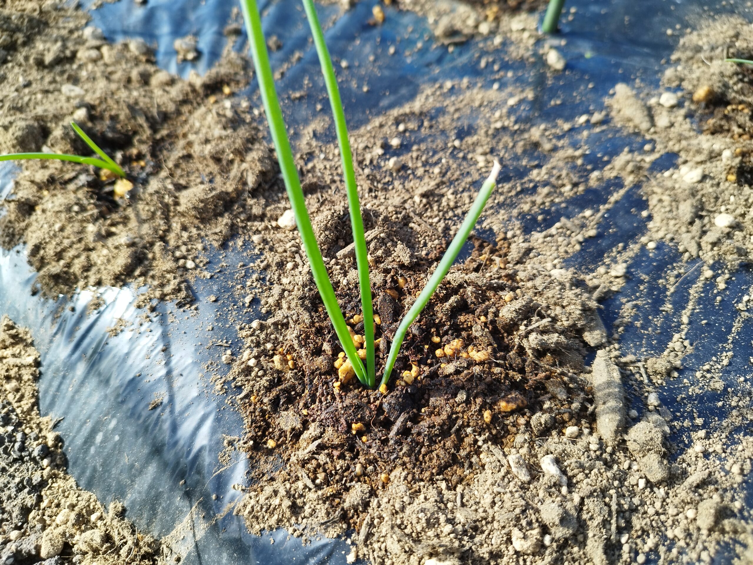 下の画像はマルチを貼った6番畝に植え付けした吊り玉ねぎ玉ねぎの苗です