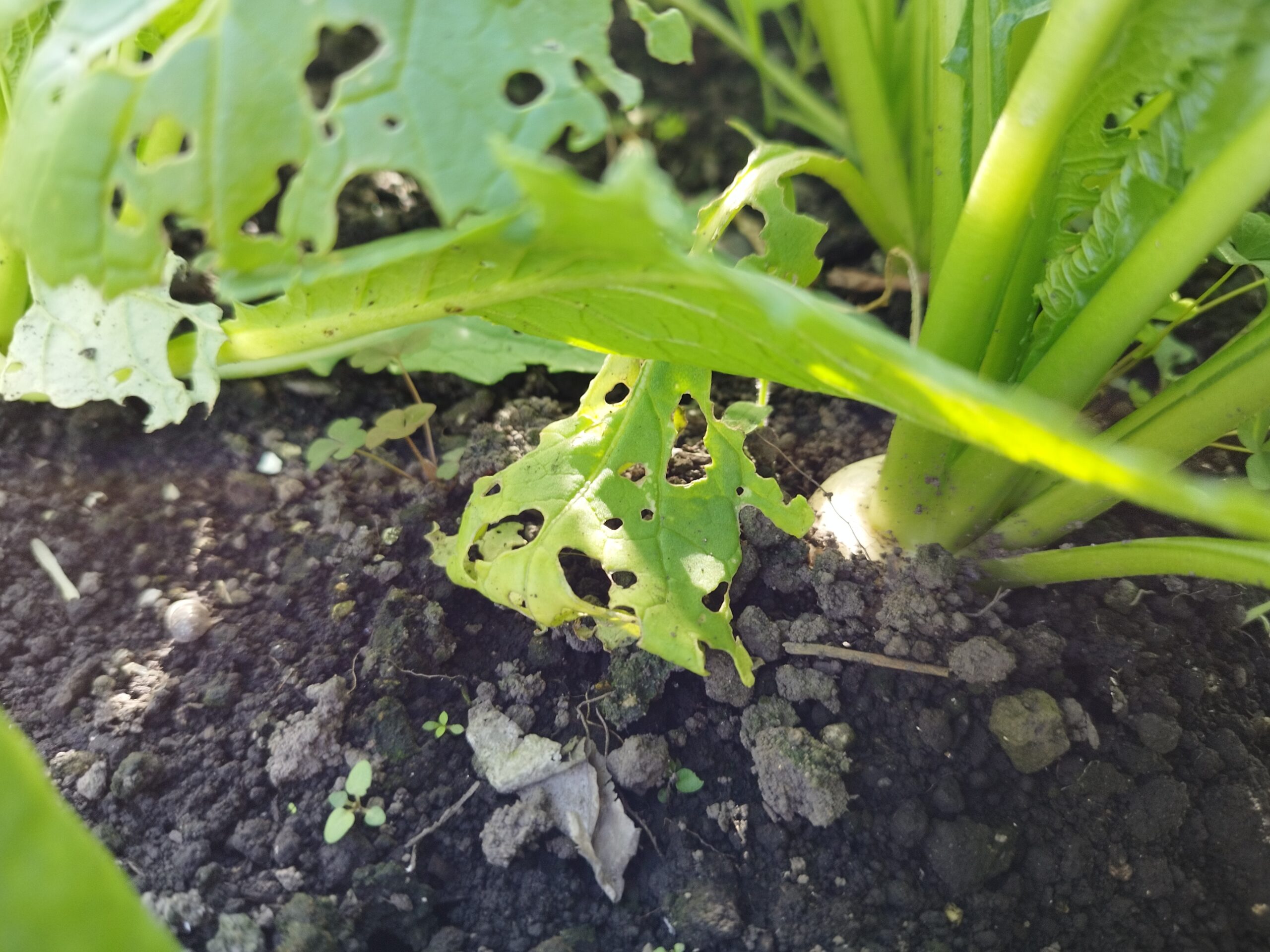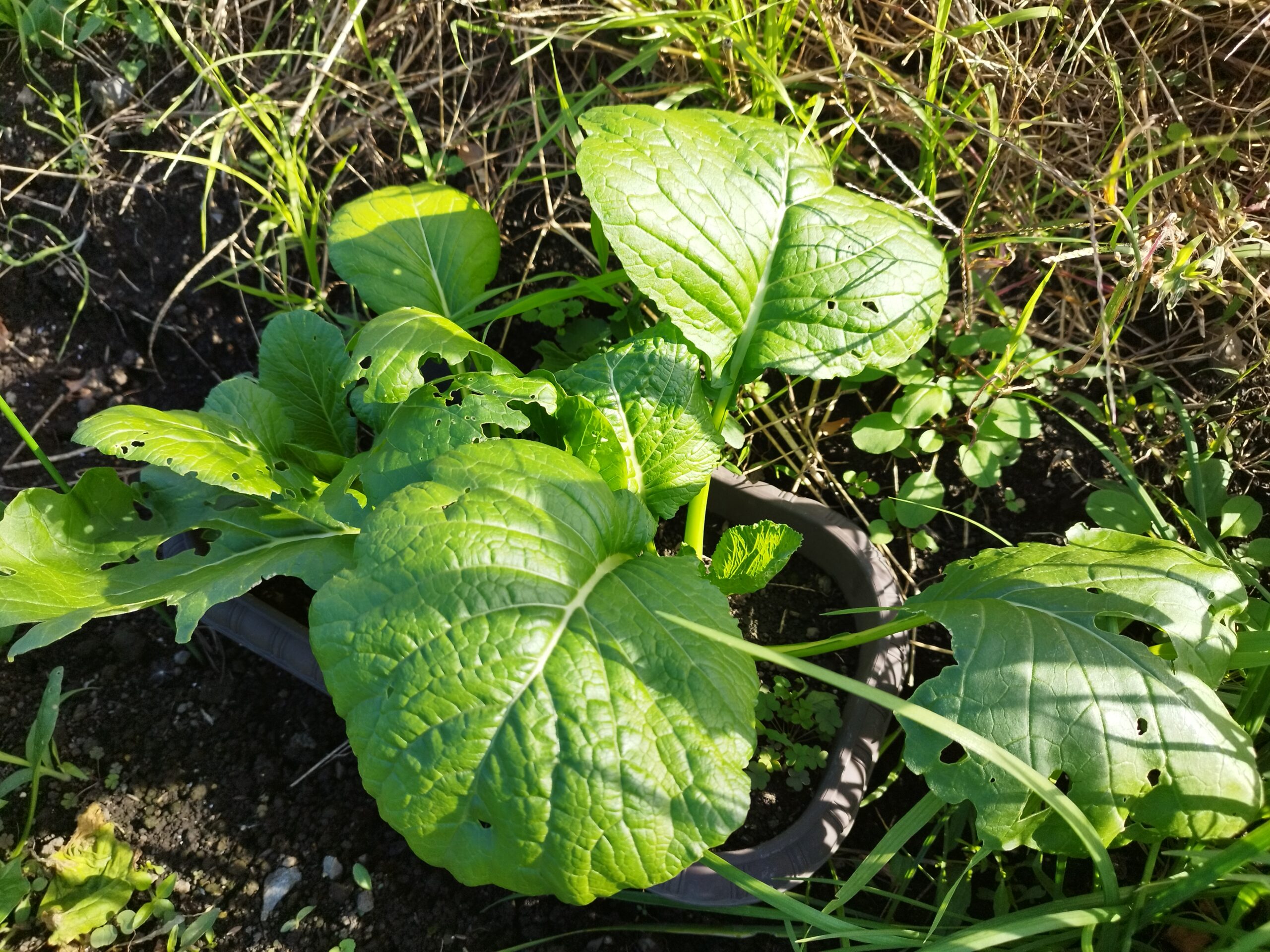 小カブは葉っぱが虫にだいぶ食べられていますが4センチほどの大きさまで成長しています