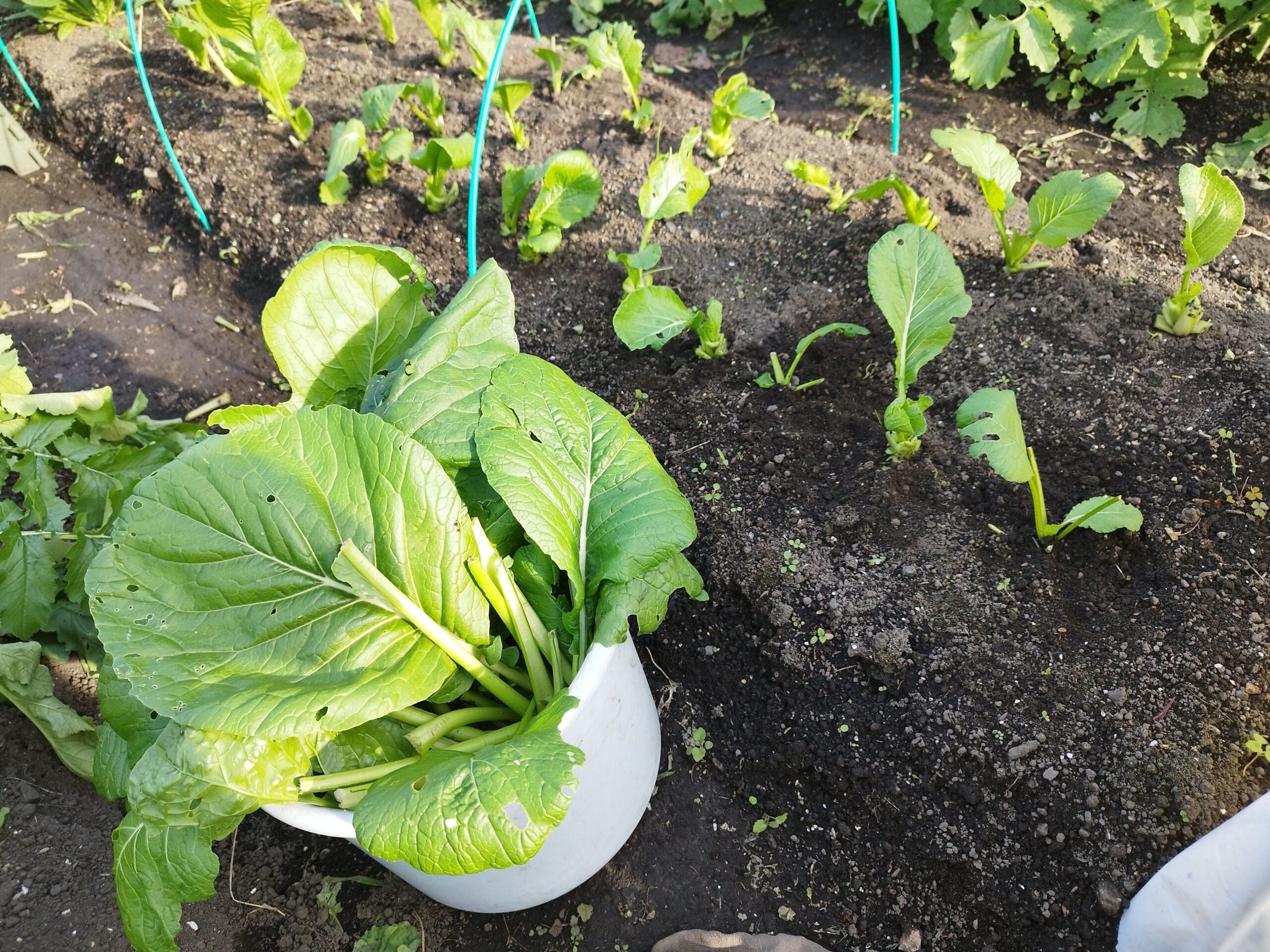 今までは小松菜も株ごと収穫していたのですが、今回はサンチュレタスと同じように大きくなった葉っぱと虫に食べられた葉っぱをカットした後に残った茎を摘み取って収穫するようにしています