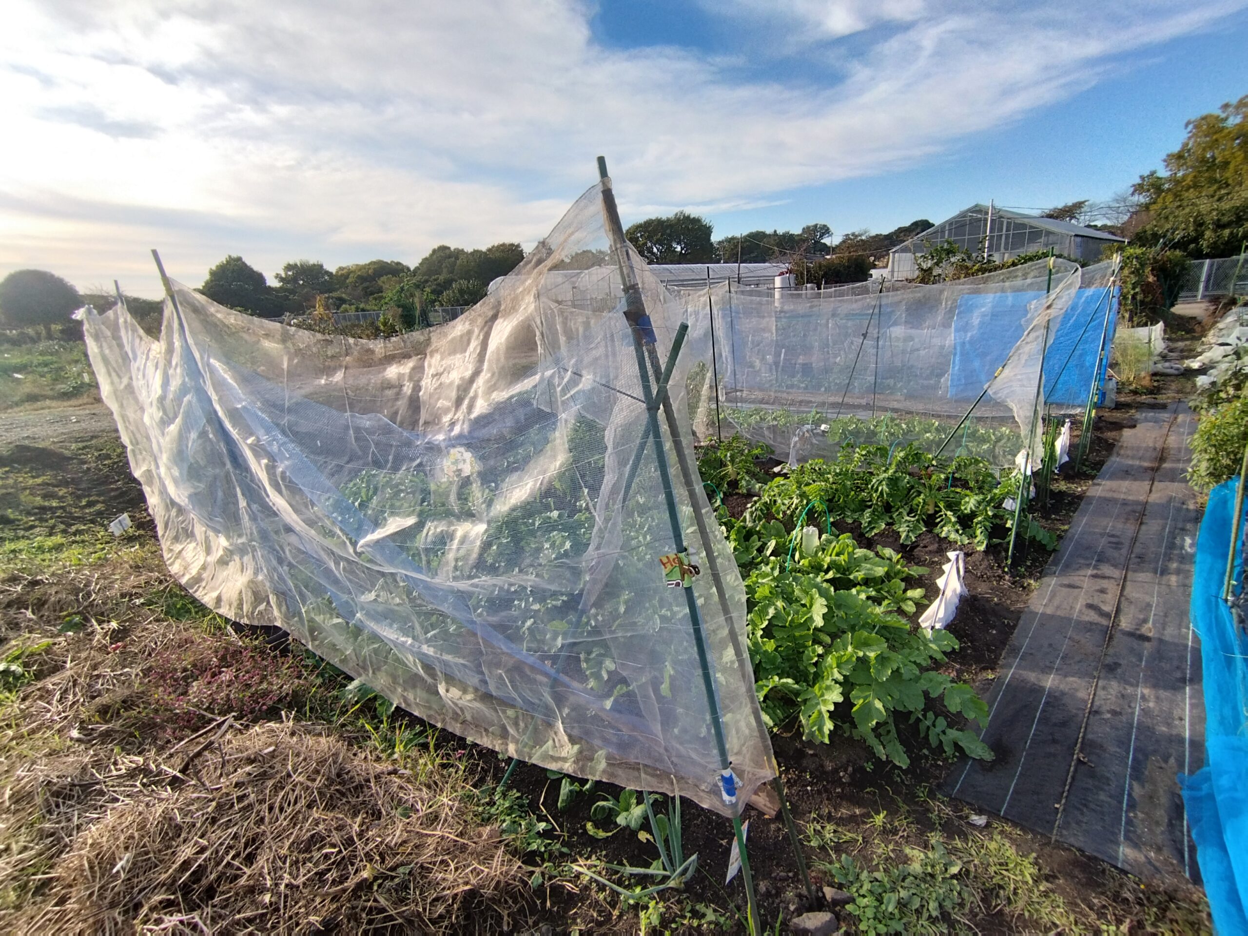 防鳥ネットと防風ネットは野菜の畝から全て撤去して立てた状態で風よけと鳥避けに使っています