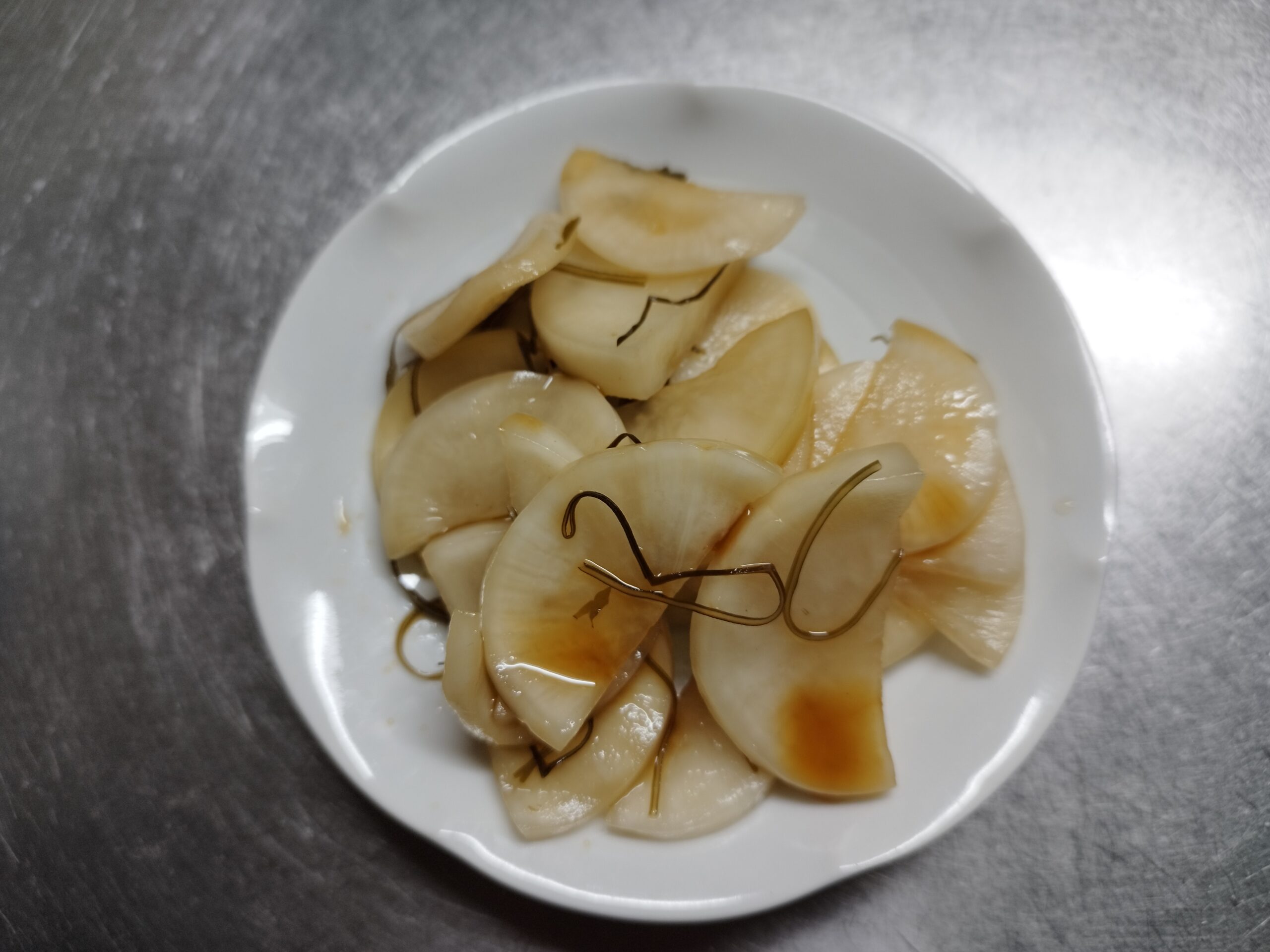 大根は塩もみして水抜きをした後に漬物の元に刻み昆布を加えて一夜漬けにして味ぽんをかけて食べると最高においしいです