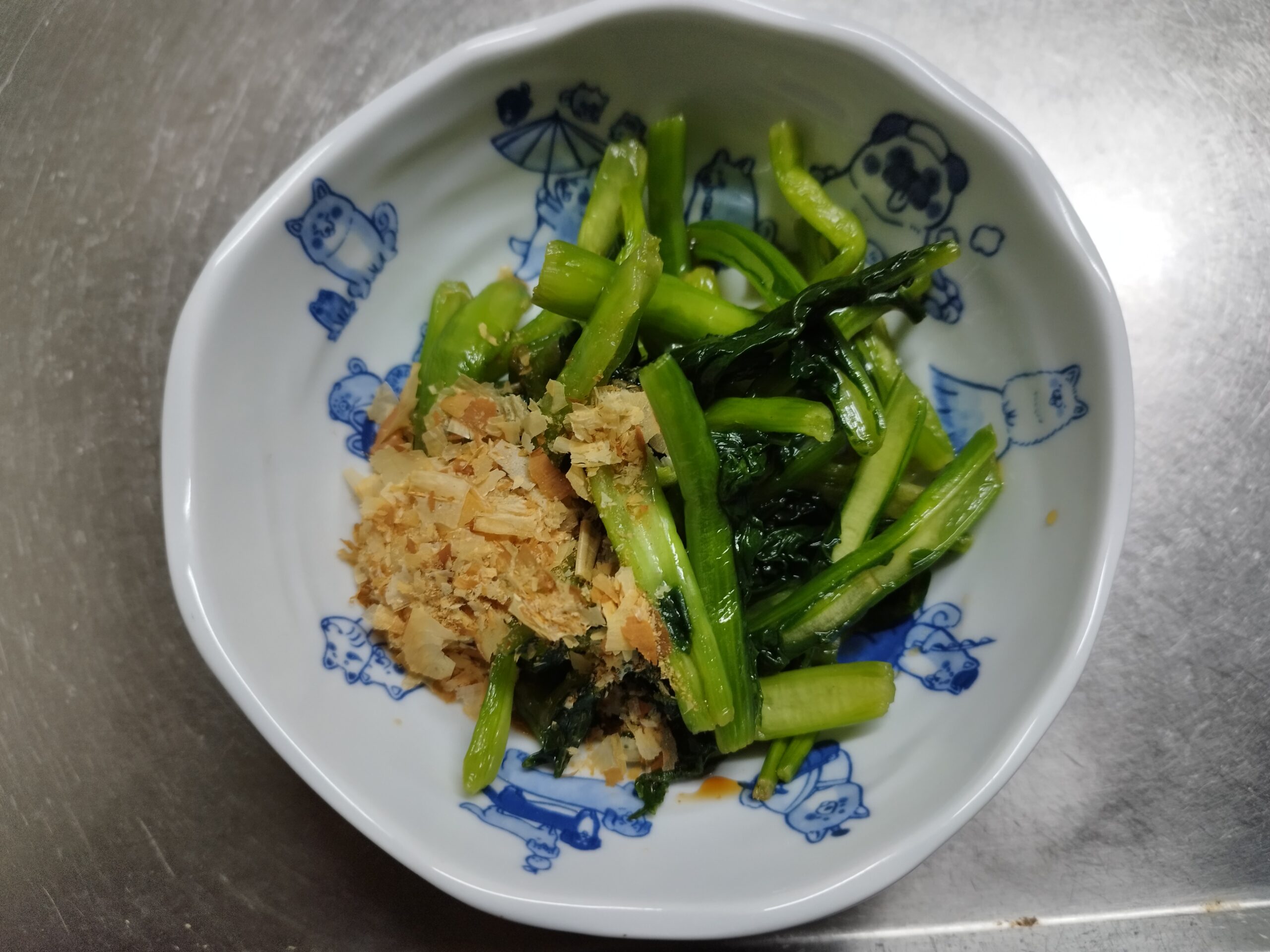 小松菜も塩もみで水抜きをして一夜漬けにして味ぽんをかけ鰹節をふりかけて食べるとお酒にぴったりの逸品料理となります